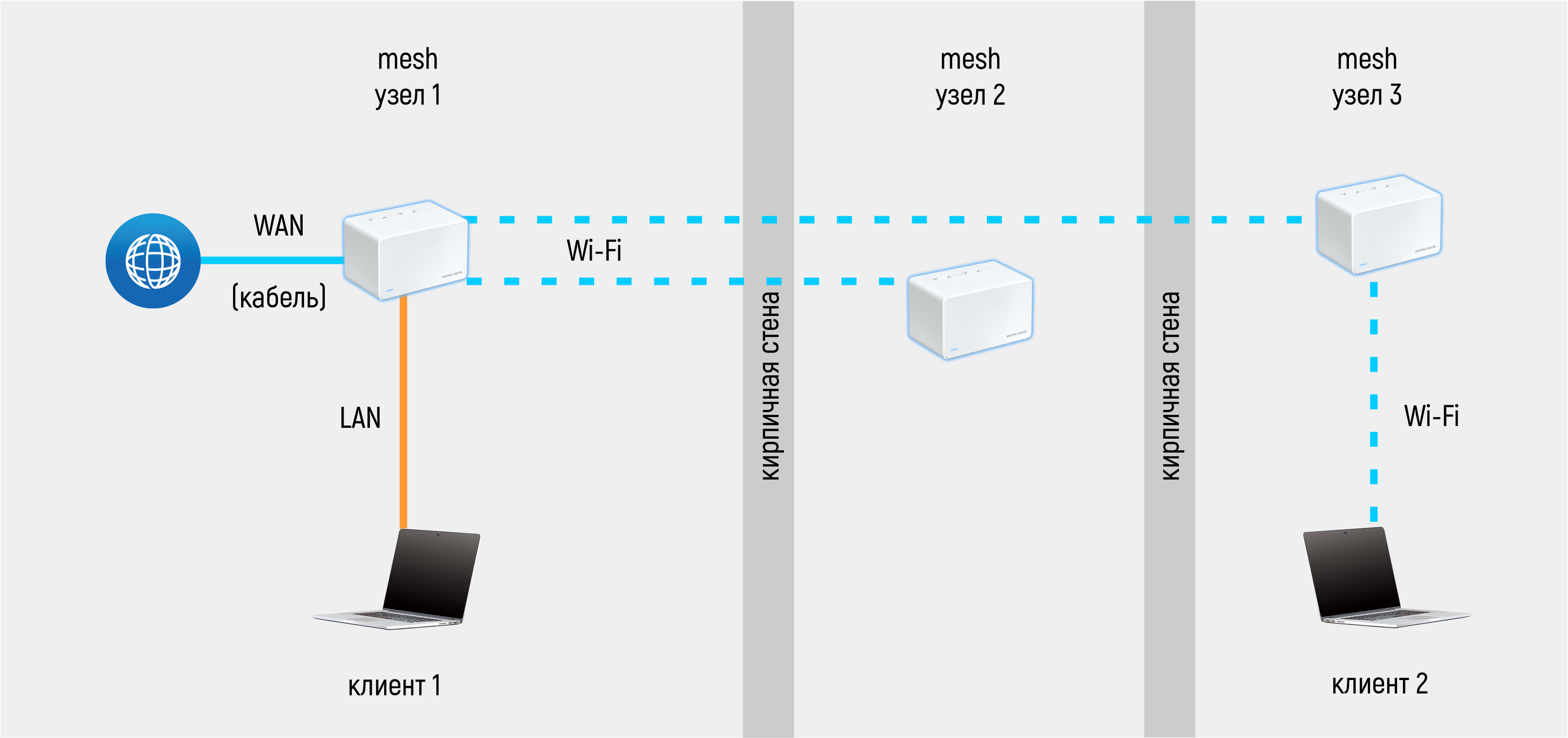 Если в процессе эксплуатации в одном из узлов mesh-сети возникнет неполадка, автоматически активируется функция самовосстановления системы, и для обеспечения бесперебойного подключения трафик перенаправляется на другие узлы.