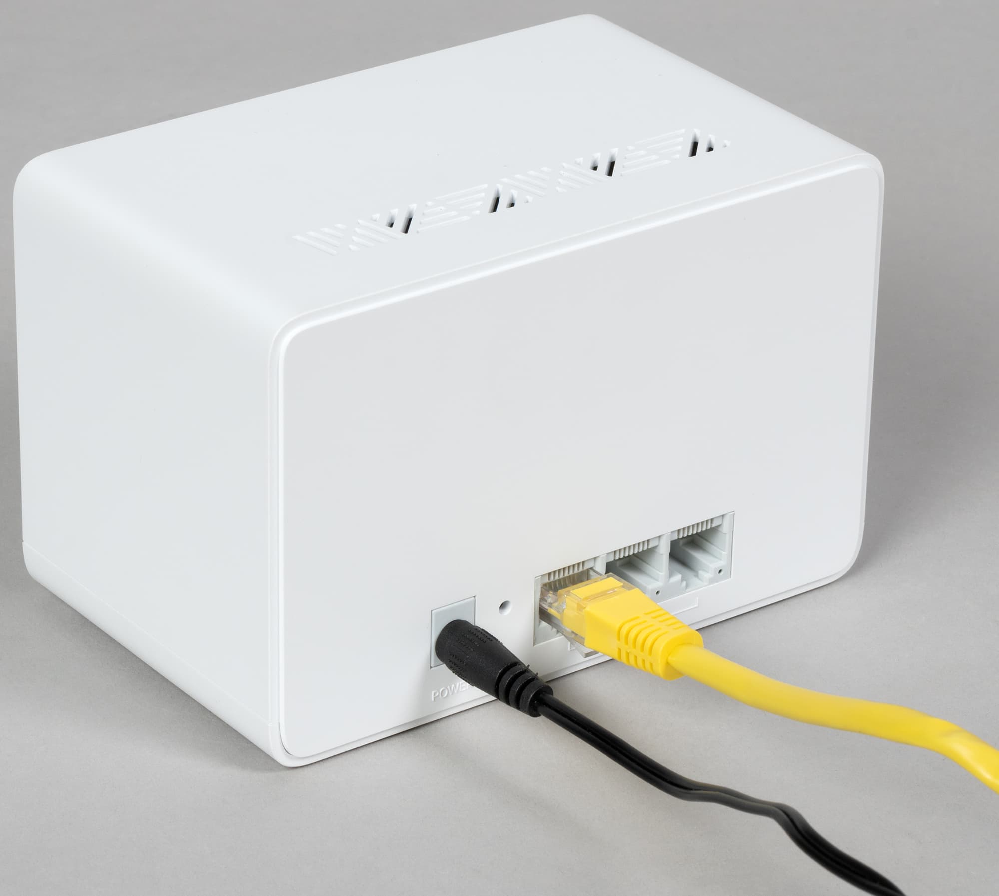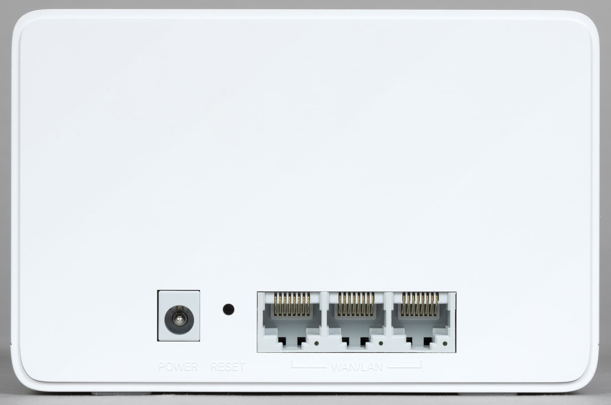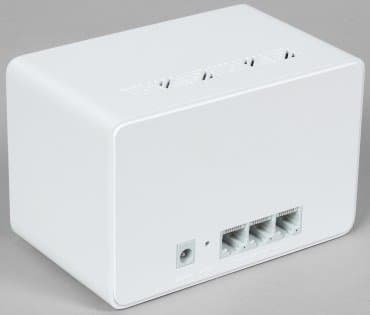 У первого узла, выполняющего функции роутера, сзади используются два разъема: адаптера питания и кабеля WAN. В других блоках второго подключения может и не быть, но первый необходим в любом случае.
