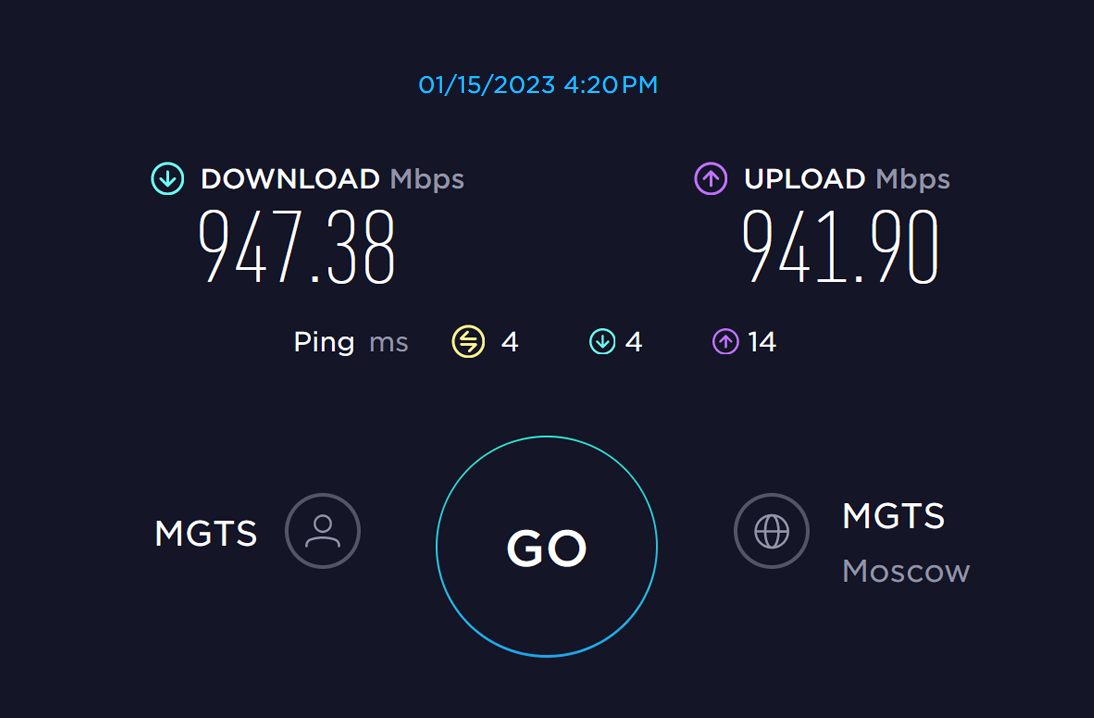 Подключение роутера mesh-системы к интернет производилось посредством пассивной гигабитной сети, входной оптический транк которой соединен с абонентским терминалом RV6699, выполняющим одновременно функции оптоэлектронного преобразователя, модема и первичного роутера WAN. Испытания скоростей кабельного подключения к роутеру (узлу 1) mesh-сети Halo H80X, проведенные при помощи Ookla Speedtest, демонстрируют скорости передачи и приема данных выше 940 Мбит/с. Это примерно соответствует реальным максимальным значениям трафика (953 Мбит/с).