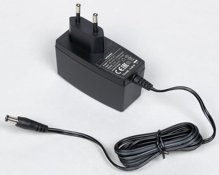 Адаптер мощностью 12 Вт с вмонтированной в его корпус евровилкой преобразует переменный ток бытовых сетей 100—240 В 50/60 Гц в постоянный 12 В 1,5 A (мощность адаптера 18 Вт). Длина кабеля питания от корпуса адаптера до конца разъема для подключения к соответствующему разъему на блоке составляет 1 м.