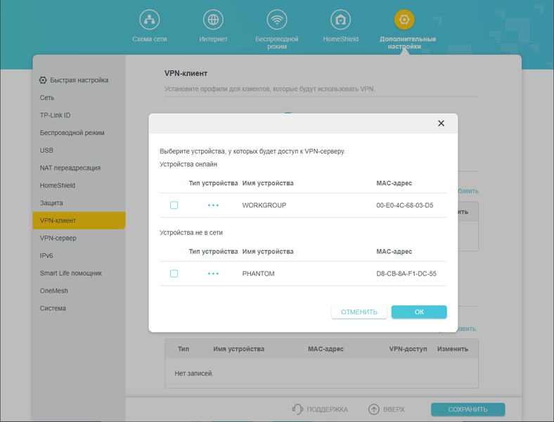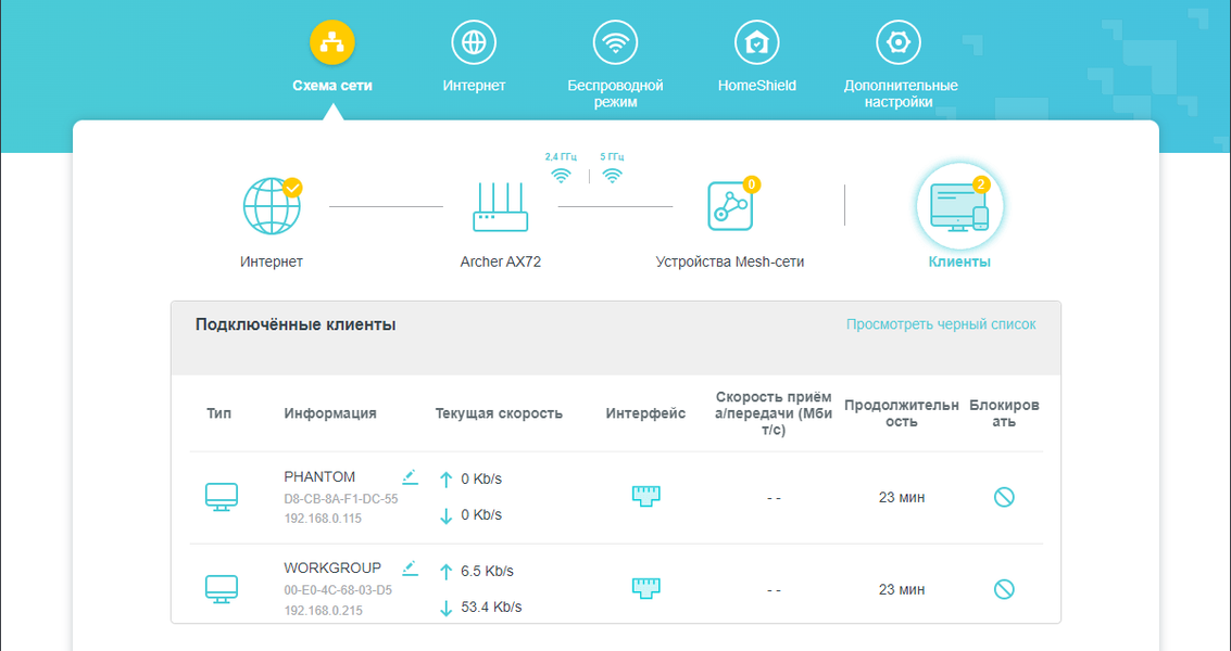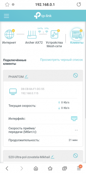 В списке клиентов фигурируют два ПК, подключенных Ethernet-кабелями к гигабитным портам LAN. Один из них, Phantom, бездействует, а при помощи другого, Workgroup, мы управляем роутером и снимаем скриншоты.