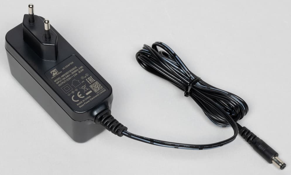 Адаптер мощностью 30 Вт с вмонтированной в его корпус евровилкой преобразует переменный ток бытовых сетей (100—240 В 50/60 Гц) в постоянный (12 В 2,5 A). Длина кабеля питания от корпуса адаптера до конца разъема для подключения к роутеру составляет 1,4 м.
