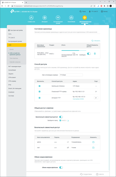 С помощью внешнего накопителя, подключенного к порту USB 3, роутер можно превратить в файловый сервер. Доступ к содержимому обеспечивается в локальной сети по протоколам SMB и FTP, а во внешней — только по FTP. В ходе испытаний мы использовали SSD емкостью 1 ТБ, отформатированный в NTFS, и проверяли его работу с одним файлом «весом» около 4,5 ГБ. Скорости копирование файла с накопителя на клиентский ПК и в обратную сторону проводили в трех сценариях подключений: