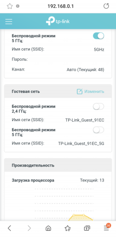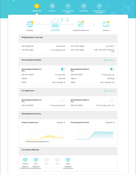 Мы организовали две раздельные сети Wi-Fi в диапазонах 2,4 ГГц и 5 ГГц. Названия сетей и пароли для доступа к ним были предложены по умолчанию, и мы, естественно, изменили их в ходе дальнейшей настройки. На вышеприведенном скриншоте видны кабельные подключения к LAN и WAN, а также показатели производительности роутера (точнее, использования его аппаратных ресурсов) в сотях долях от максимума. Загрузка процессора составляет 12%, использование оперативной памяти — 52%.