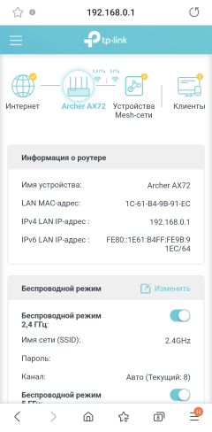 Управление TP-Link Archer AX72 осуществляется двумя способами: издавна привычным, с использованием веб-интерфейса, или более современным, с помощью мобильного приложения, установленного на смартфон или планшет под управлением Android или iOS..