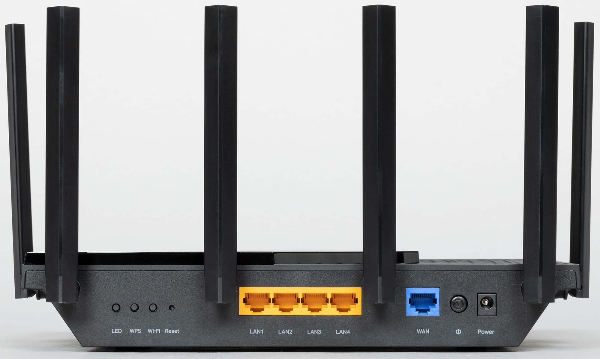 На задней панели слева видны аппаратный выключатель свечения светодиодных индикаторов, кнопка активации режима защищенной установки (WPS), отключения беспроводной связи и отверстие для доступа к утопленной внутрь кнопки Reset. В центре, во вставке желтого цвета помещается блок из четырех гигабитных LAN-портов (разъемы RJ-45), а справа на голубой врезке — порт WAN с коннектором того же стандарта. У всех проводных интерфейсов отсутствуют индикаторы сетевой активности. Еще правее расположены выключатель питания роутера и гнездо адаптера питания.