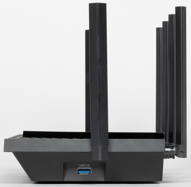 На левой боковой панели смонтирован разъем Type A порта USB 3, который служит для подключения 3G/4G-модема или внешнего накопителя. Последний для работы с роутером должен быть размечен в соответствии с одним из поддерживаемых типов файловых систем: NTFS (Windows), FAT и exFAT (DOS), HFS+ (macOS).