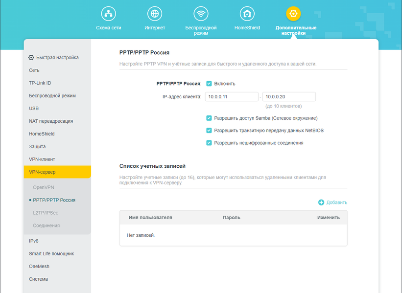 При создании сервера PPTP можно обеспечить доступ к Samba и сквозной трансляции данных NetBIOS, а также разрешить или запретить соединения без шифрования по протоколу MPPE со 128-битным кодированием.