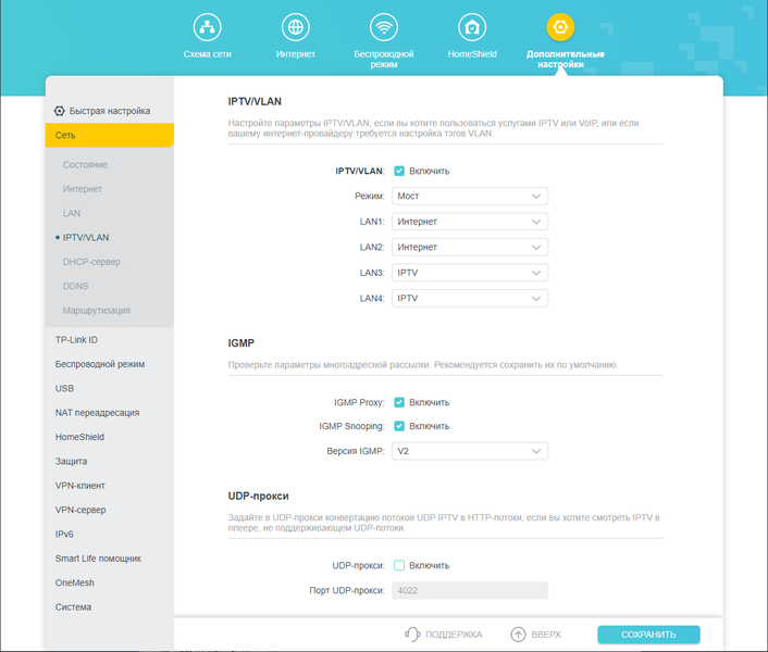 TP-Link Archer AX72 дает возможность организовать доступ к интернет-телевещанию с использованием IPTV/VLAN, протоколов управления интернет-группами (IGMP) и пользовательских датаграм (UDP).