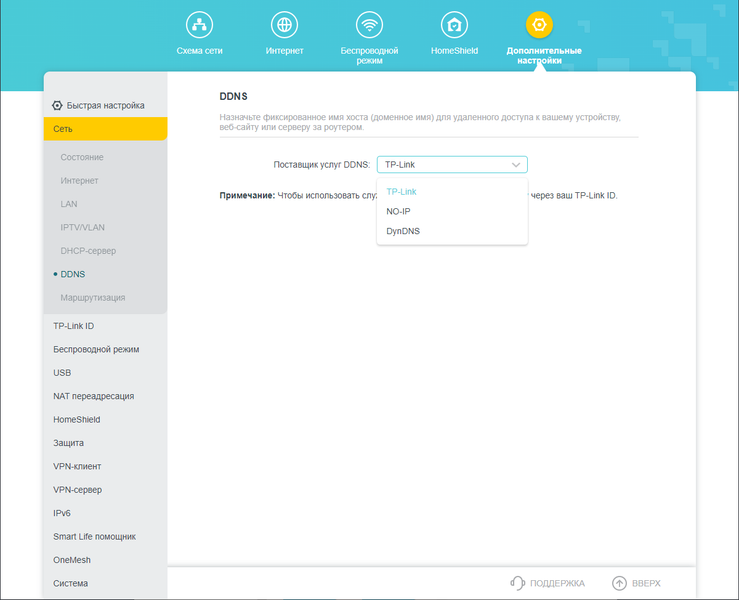 | Динамическое назначение имен (DDNS) | TP-Link, No-IP, DynDNS |