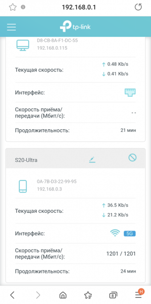 Информационные панели интернет-подключения, текущего состояния роутера и загрузки аппаратных компонентов высокоинформативны. Пользоваться ими удобно, но приходится постоянно прокручивать содержимое, поскольку информации много, и на одном экране смартфона она не помещается.
