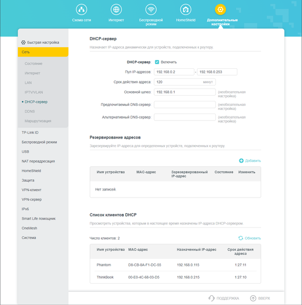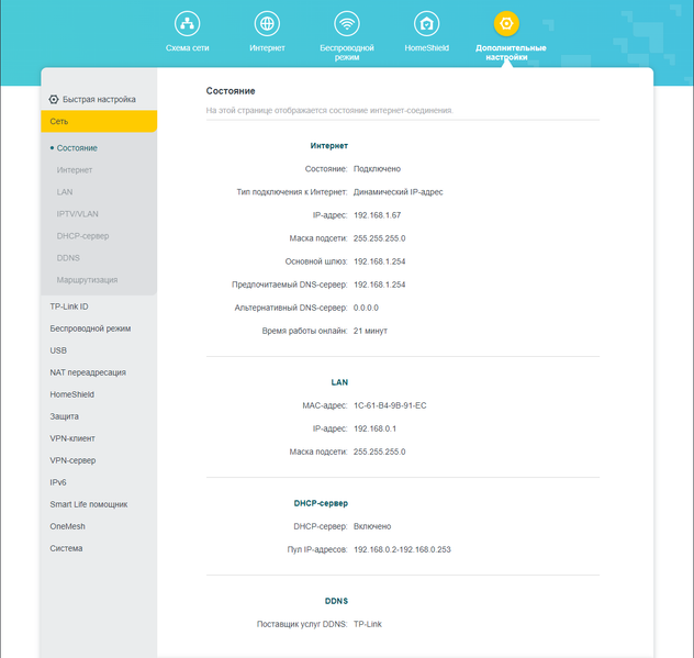 Статус указывает, что WAN-подключение получило динамический IP 192.168.1.67 от роутера провайдера 192.168.1.254, ставшего основным шлюзом и предпочитаемым DNS-сервером. В свою очередь TP-Link Archer AX72 фигурирует в подсети LAN с адресом 192.168.0.1, и его собственный DHCP-сервер резервирует в ней пул из 253 адресов для клиентов, с 192.168.0.2 по 193.168.0.253. При необходимости установки сервера DHCP можно изменить, включая срок действия IP, назначаемого им клиенту.