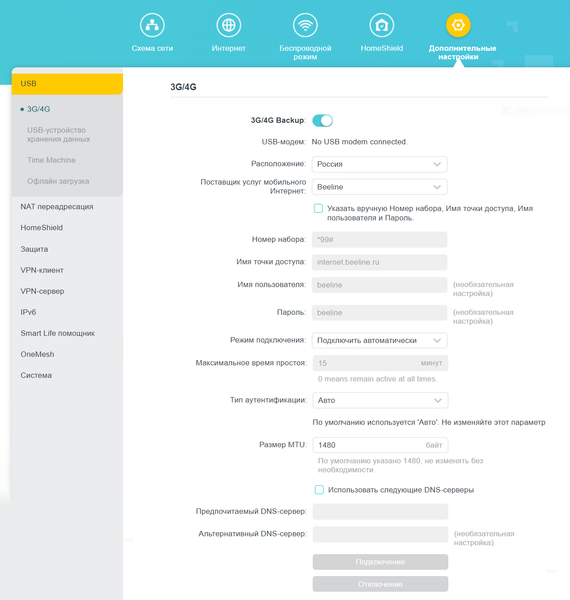 TP-Link Archer AX72 оснащен интерфейсом USB 3.0 (разъем Type-A). С его помощью можно подключить к роутеру 3G/4G-модем и организовать раздачу трафика соответствующих сотовых сетей.