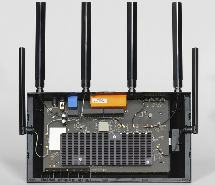 Путем непростых манипуляций с ранее упомянутыми винтами и скрытыми пластмассовыми защелками можно снять днище и разглядеть, что находится внутри. Впрочем, взору при этом открываются лишь второстепенные детали, а всё самое интересное (в первую очередь, однокристальная система) скрыто под большим радиатором. Демонтаж этого радиатора в бытовых условиях явно не предусмотрен, поскольку это лишает роутер работоспособности, а пользователя — гарантии производителя.