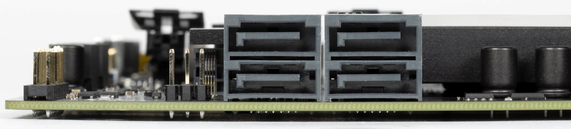 Всего у платы 4 разъема Serial ATA 6 Гбит/с + 1 слот для накопителей в форм-факторе M.2. 4 порта SATA реализованы через чипсет B550 и поддерживают создание RAID.