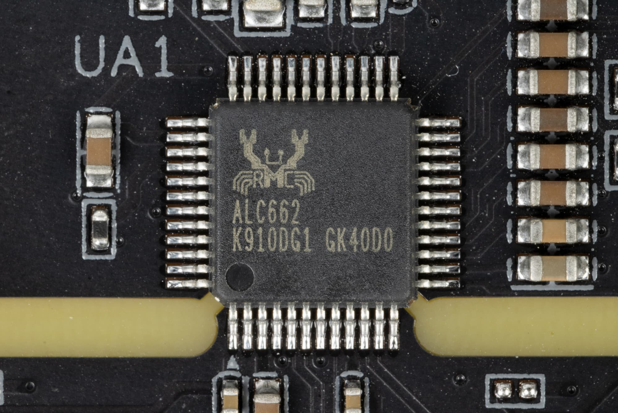 Аудиотракт вынесен на угловую часть платы, не пересекается с другими элементами. Все аудиоразъемы на задней панели имеют привычную цветовую окраску.