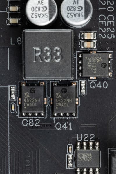 Каждый канал фазы имеет суперферритовый дроссель и набор полевых транзисторов SM4377/4522 от Sinopower Semiconductor (до 50А).