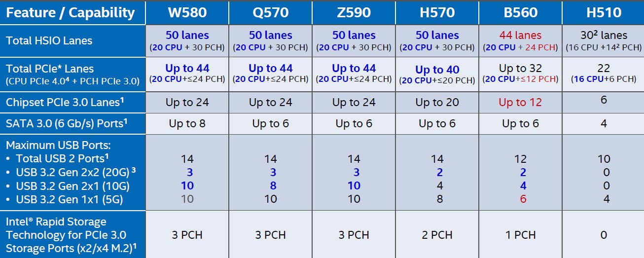 Как известно, с выходом нового семейства процессоров 11го поколения компания Intel анонсирована и целую линейку системных чипсетов серии 5хх. Основные отличия приведены в таблице ниже.