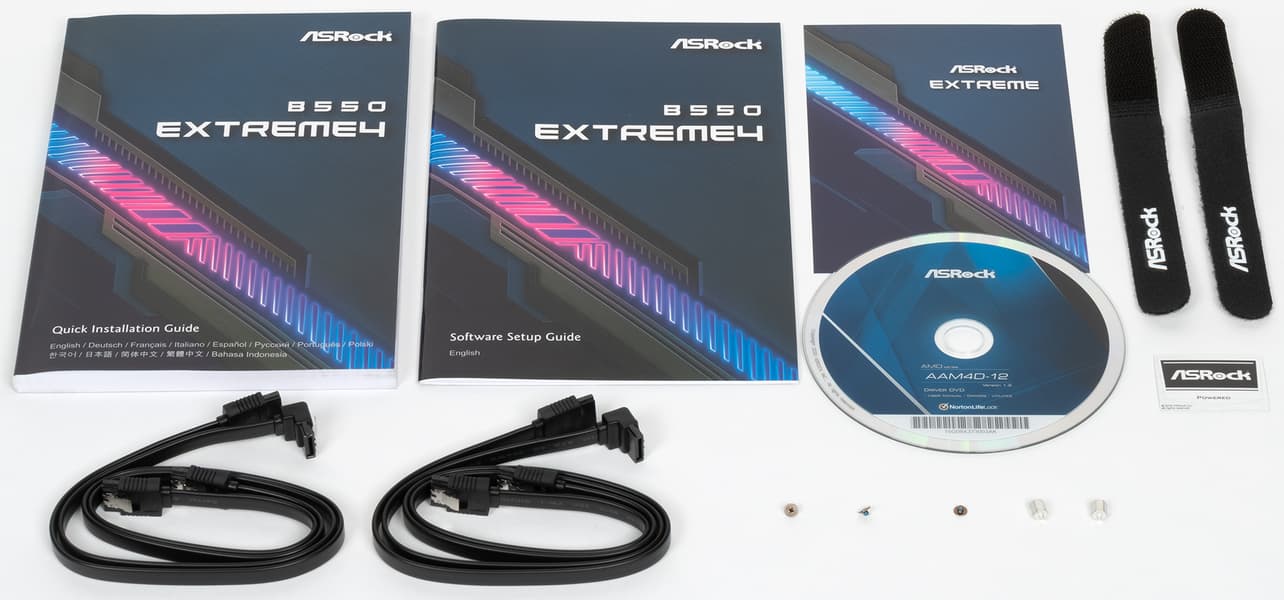 Комплект поставки банален. Кроме традиционных элементов типа руководства пользователя и кабелей SATA (что уже много лет является обязательным набором ко всем материнкам), имеются: винтики для монтажа модулей M.2, накопитель типа CD c ПО, бонусные стикер и стяжки.