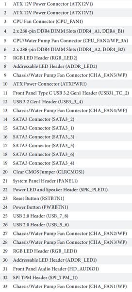 | Прочие внутренние элементы | 24-контактный разъем питания ATX 1 8-контактный разъем питания EPS12V 1 4-контактный разъем питания EPS12V 1 слот M.2 (E-key) без адаптера беспроводных сетей (приобретается отдельно) 1 разъем для подключения 2 портов USB 3.2 Gen1 2 разъема для подключения 4 портов USB 2.0 7 разъемов для подключения 4-контактных вентиляторов и помп ЖСО 2 разъема для подключения неадресуемой RGB-ленты 2 разъема для подключения адресуемой ARGB-ленты 1 разъем аудио для передней панели корпуса 1 разъем TPM 2 разъема для подключения управления с передней панели корпуса |