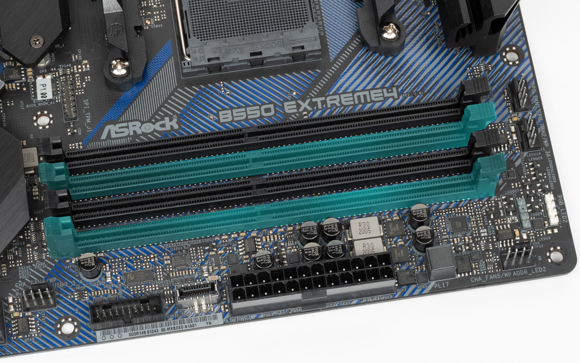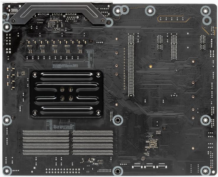 Форм-фактор ATX имеет размеры до 305×244 мм, а E-ATX — до 305×330 мм. Материнская плата ASRock B550 Extreme4 имеет размеры 305×244 мм, поэтому выполнена в форм-факторе ATX, и на ней имеются 10 монтажных отверстий для установки в корпус.