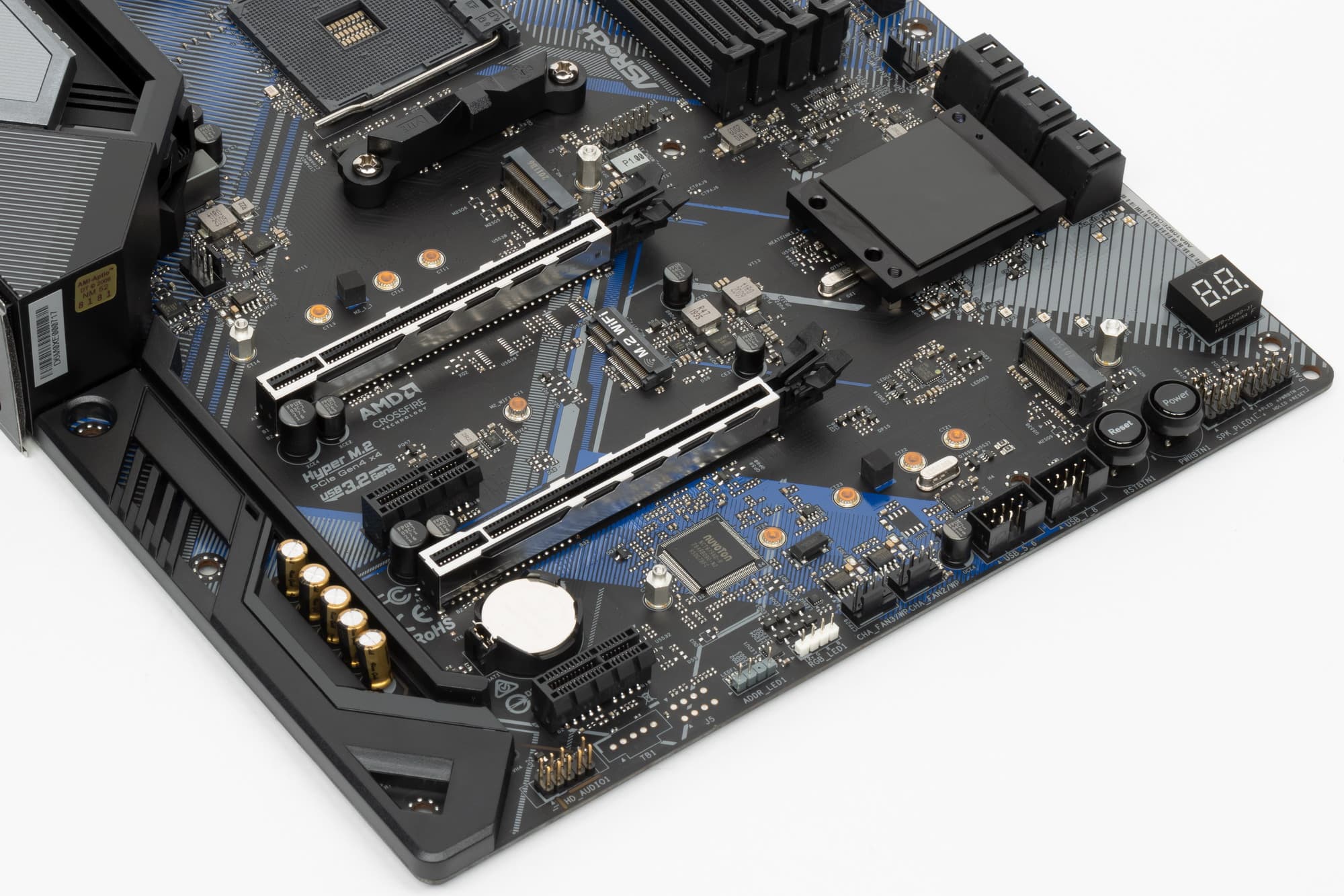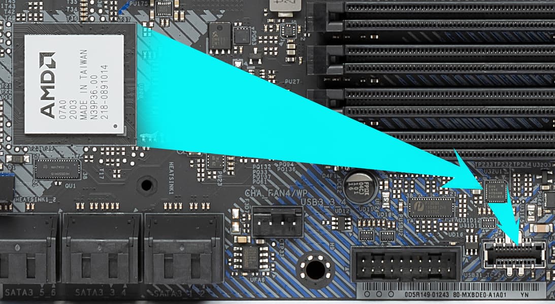 Оба слота M.2 поддерживают модули с любым интерфейсом, а размеры могут быть от 2230 до 2080 у M.2_1 и до 22110 у M.2_2. Слот M.2_2 получает данные от чипсета B550 и делит ресурсы с портами SATA 5 и 6.