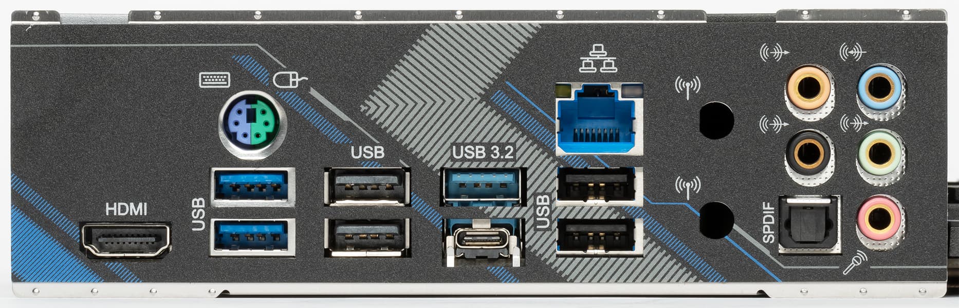 | Разъемы на задней панели | 1 × USB 3.2 Gen2 (Type-C) 1 × USB 3.2 Gen2 (Type-A) 2 × USB 3.2 Gen1 (Type-A) 4 × USB 2.0 (Type-A) 1 × RJ-45 5 аудиоразъемов типа миниджек 1 × оптический аудио S/PDIF 1 × HDMI 2.1 1 × универсальный разъем PS/2 |