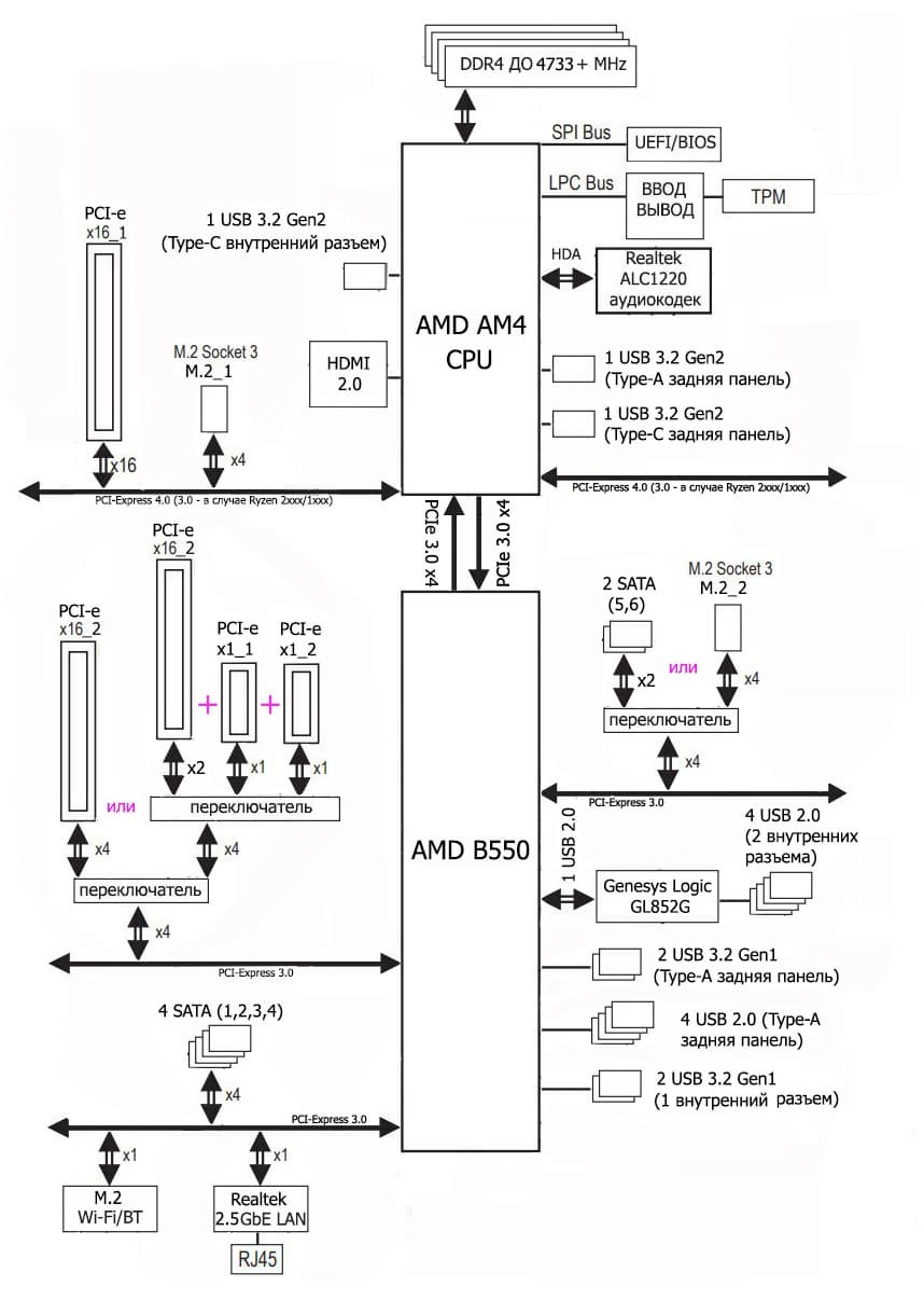 Процессоры Ryzen 3000/5000 суммарно имеют 24 линии ввода-вывода (включая PCIe 4.0). 4 линии (в данном случае превращаясь в PCIe 3.0) идут на связь с чипсетом B550. Еще 16 линий — это PCIe слоты для видеокарт. Осталось 4 линии: они могут конфигурироваться производителями материнских плат на выбор (либо-либо):