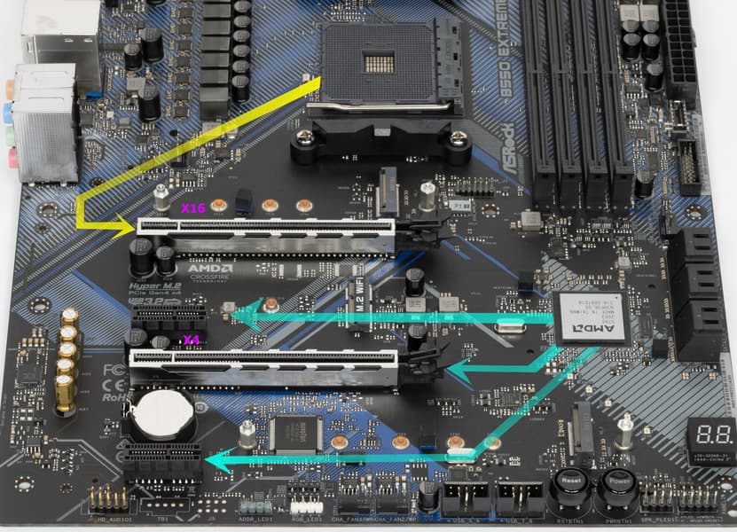 Итак, кроме USB-портов, к которым мы подойдем позже, чипсет B550 обладает 14 PCIe линиями (плюс 4 линии на аплинк с процессором). Считаем, сколько линий уходит на поддержку (связь) с тем или иным элементом (надо учитывать, что из-за дефицита PCIe линий некоторые элементы периферии делят их, и потому использовать одновременно нельзя: для этих целей у материнской платы существуют мультиплексоры):
