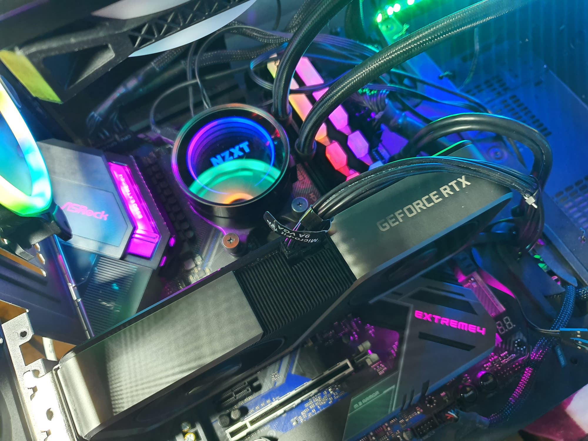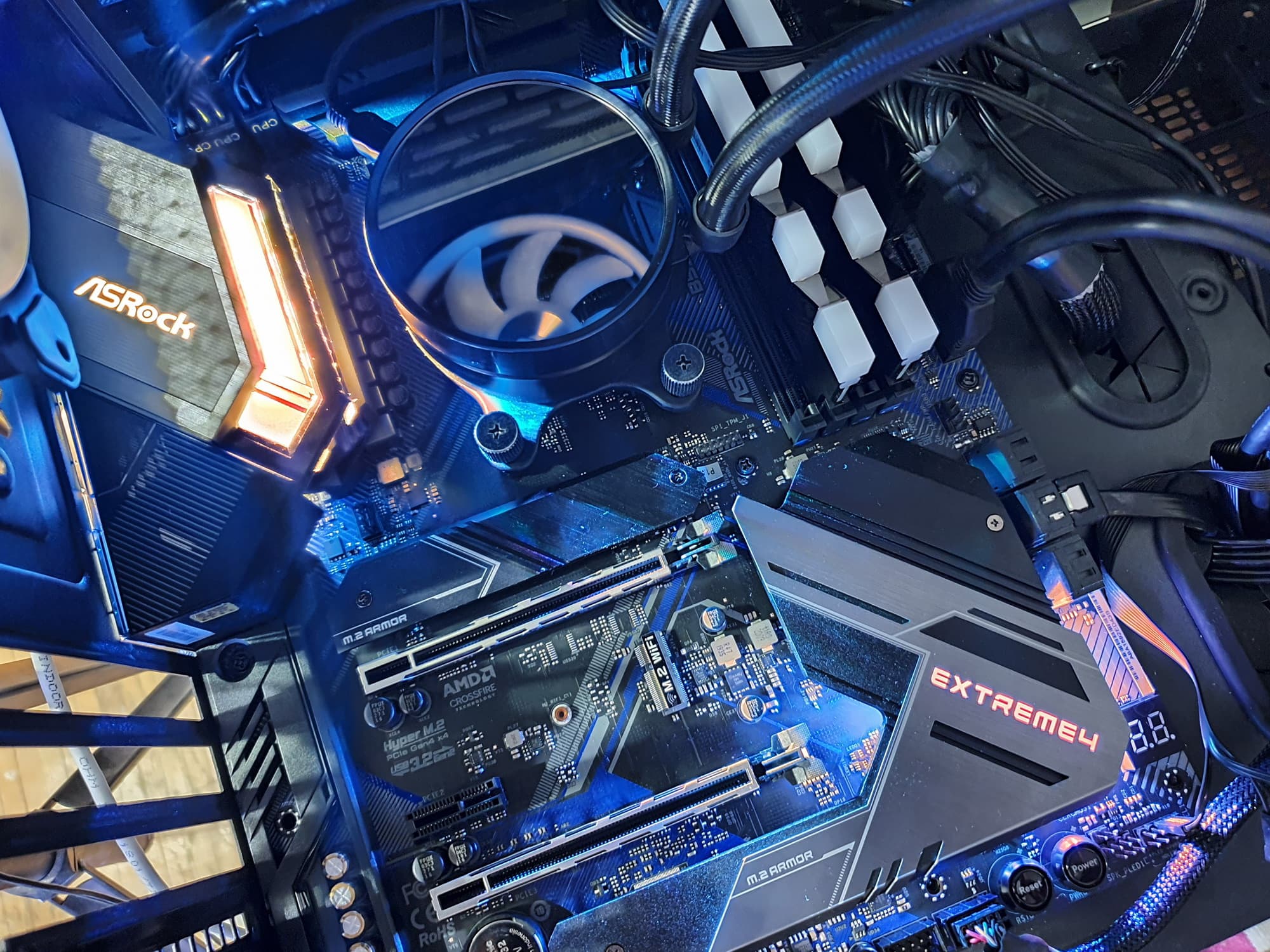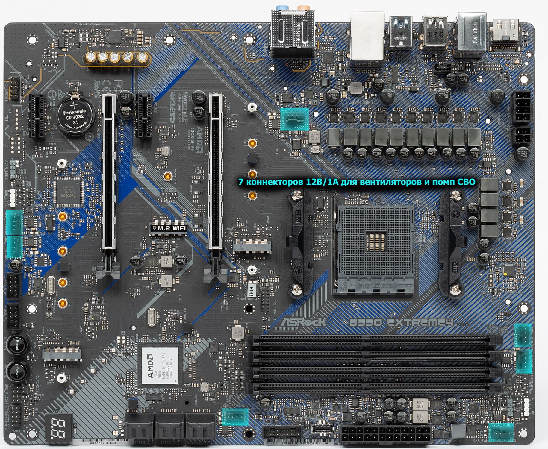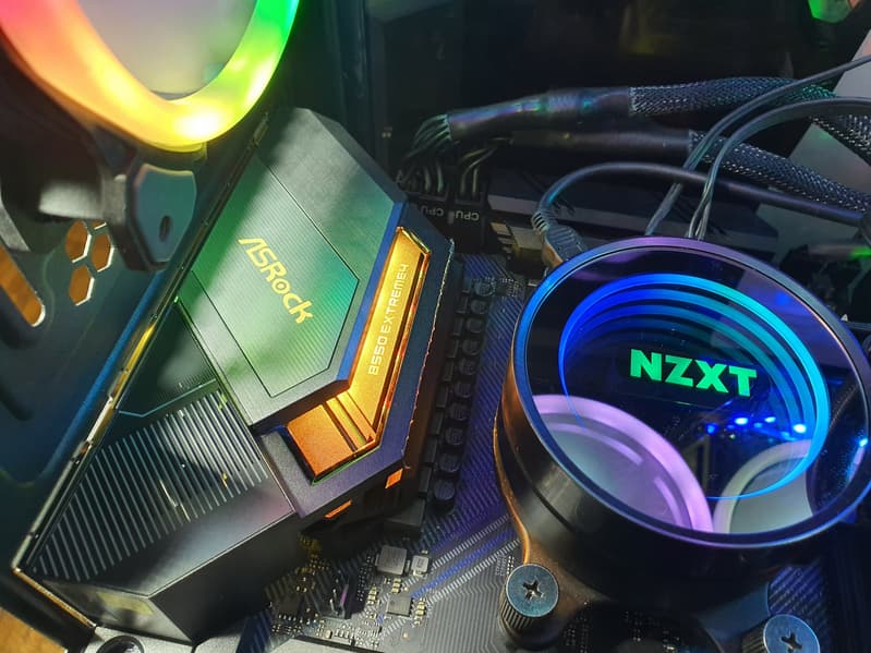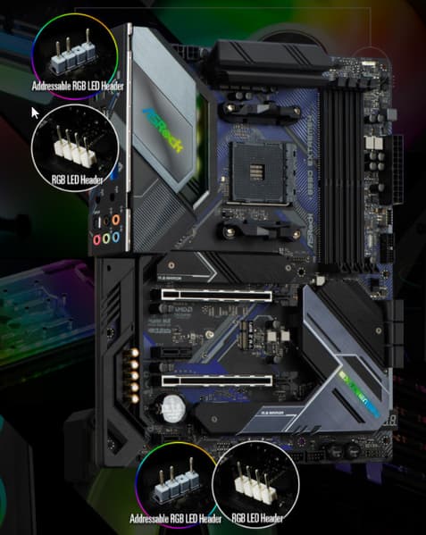 Для своей стоимости функциональность у ASRock B550 Extreme4 очень хорошая. Она имеет 15 портов USB разных видов (включая 3 USB3 Gen2), 2 слота PCIe х16 (из которых первый получает 16 линий PCIe от процессора) с возможностью создать AMD CrossFire, 2 слота PCIe x1 для карт расширения, 2 слота M.2, 6 портов SATA. Плата предлагает 7 разъемов для подключения вентиляторов и помп, радиаторами оснащены все накопители в слотах M.2. Разве что проводной сетевой контроллер всего один, однако он высокоскоростной, 2,5-гигабитный. Стоит отметить наличие подсветки, включая широкие возможности для подключения дополнительных RGB-устройств.