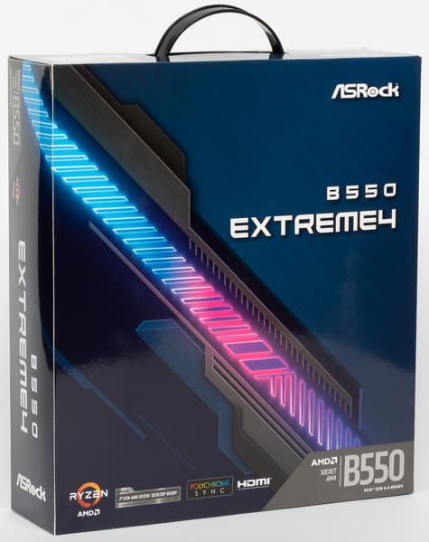 ASRock B550 Extreme4 поставляется в толстой картонной коробке, которая в свою очередь упакована в глянцевый супер с ручкой, чтобы показать, что данный продукт является топовым из всех, что выпущено на В550.