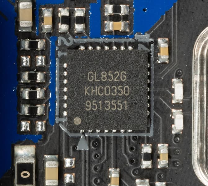 Итак, через чипсет B550 реализовано 4 USB 3.2 Gen1 и 4 USB 2.0 выделенных порта. Плюс контроллер Genesys Logic GL852S имеет связь с B550 через 1 линию USB 2.0.