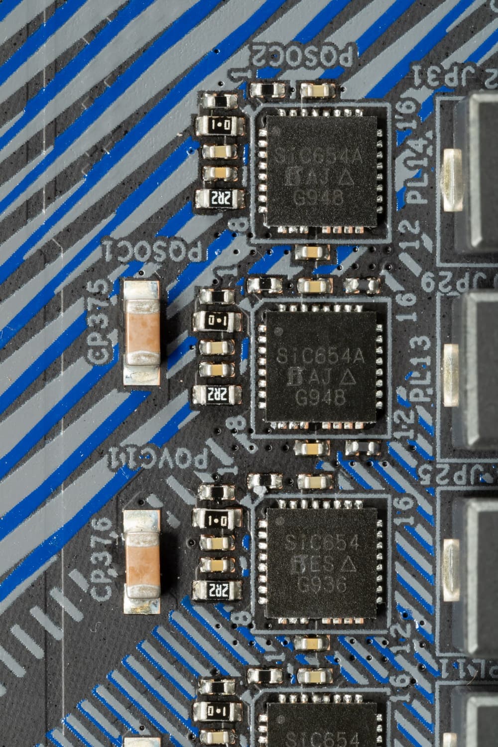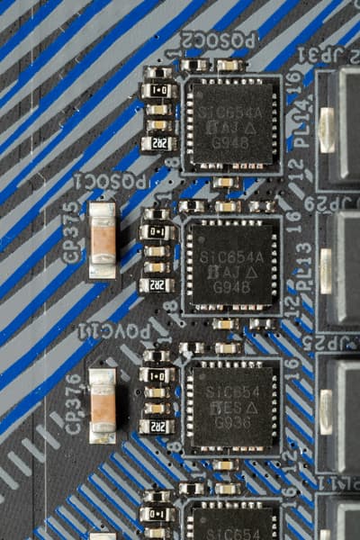 Каждый канал фазы имеет суперферритовую катушку и MOSFET SiC654A от Vishay.