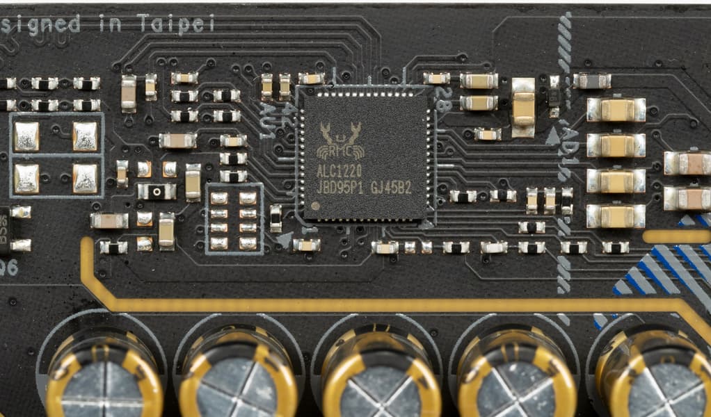 Как и во всех современных материнских платах звуком заведует аудиокодек Realtek ALC1220. Он обеспечивает вывод звука по схемам до 7.1.