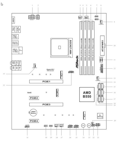 Плюс 14 линий PCIe, выделенные на поддержку иной периферии (включая те же самые контроллеры USB). Итого, у B550 в данном случае реализованы почти все его возможные порты.