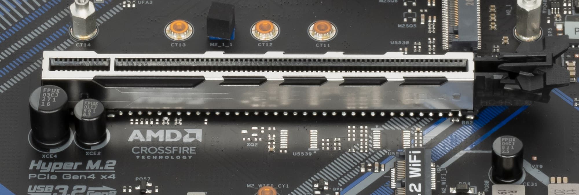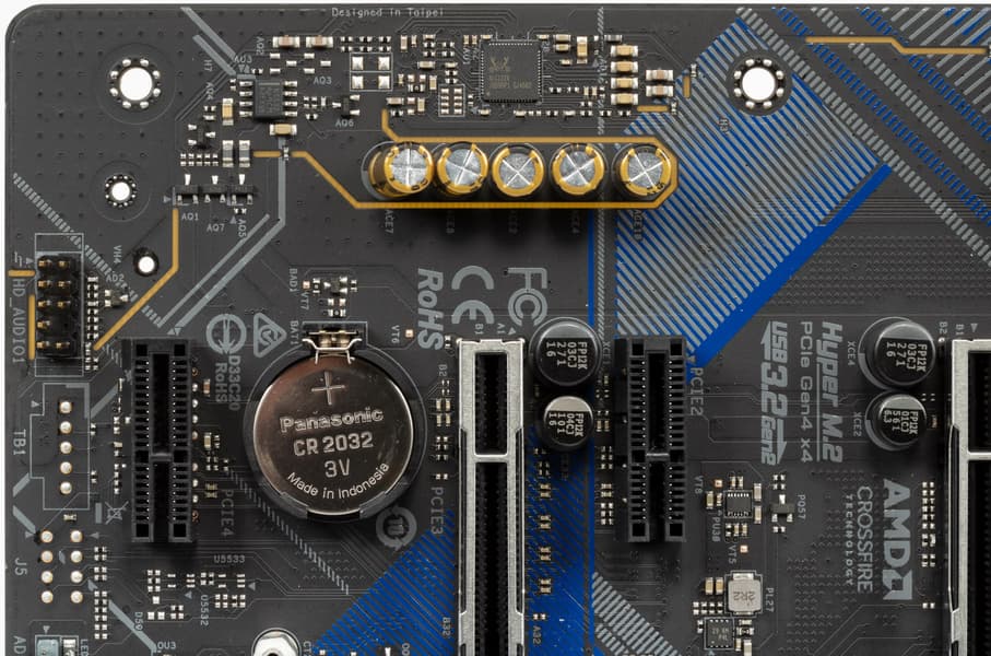 Всего на плате есть 4 слота PCIe: два PCIe x16 (для видеокарт или других устройств) и два «коротких» PCIe x1 (второй и четвертый по счету). Если про первый PCIe x16_1 я выше уже рассказал (он подключен к CPU), то второй PCIe x16_2 (третий по счету) подключен к B550 и максимально работает в режиме х4. Он также делит ресурсы с двумя слотами PCIe x1_1/1_2: если какие-либо из последних заняты, то слот PCIe x16_2 работает в режиме PCIe x2, а если PCIe x1_1/1_2 свободны, то слот PCIe x16_2 получает x4, и только тогда можно организовать режим AMD CrossFire из двух видеокарт.