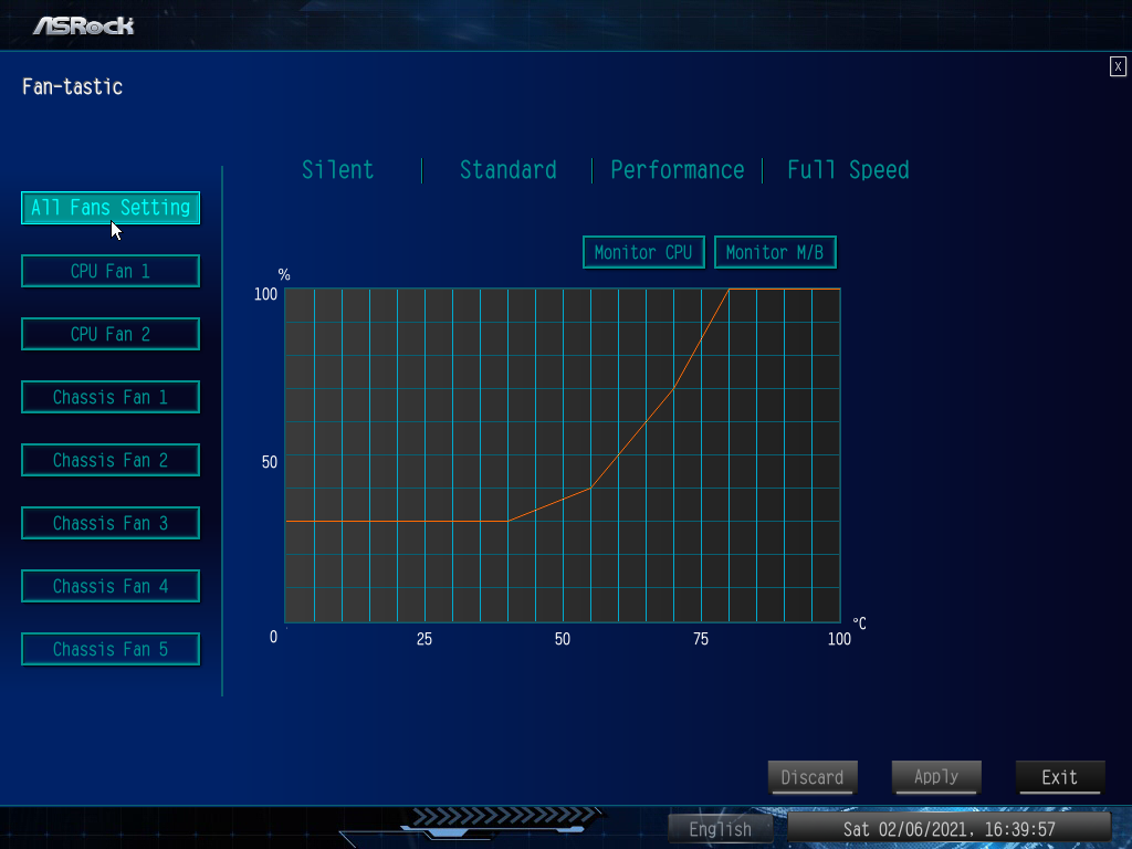 Наиболее интересной частью данной программы является возможность настраивания работы вентиляторов (мы не забываем, что у материнской платы есть 7 гнезд для подключения вентиляторов).