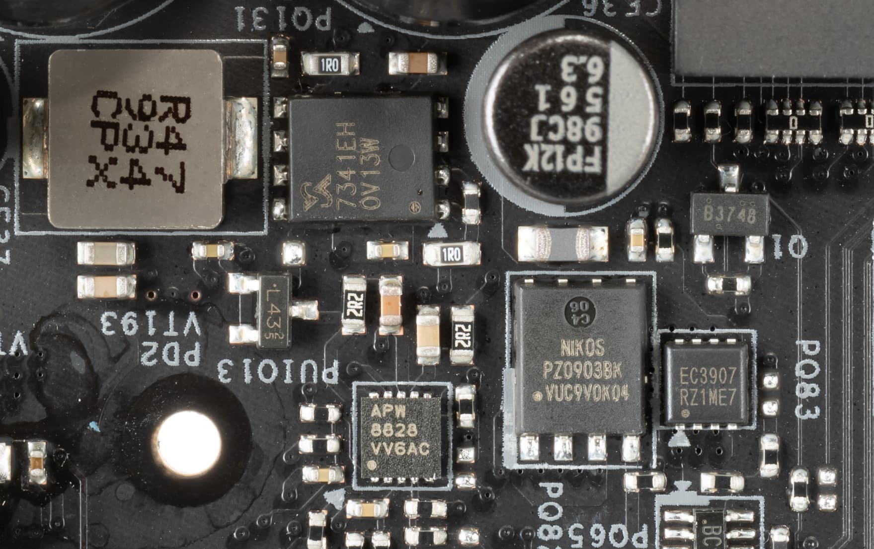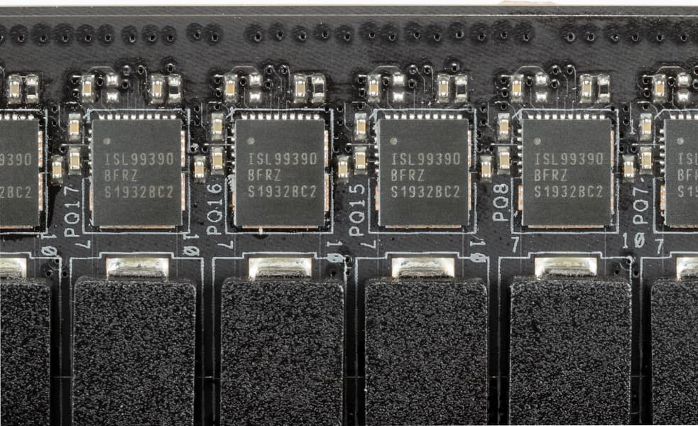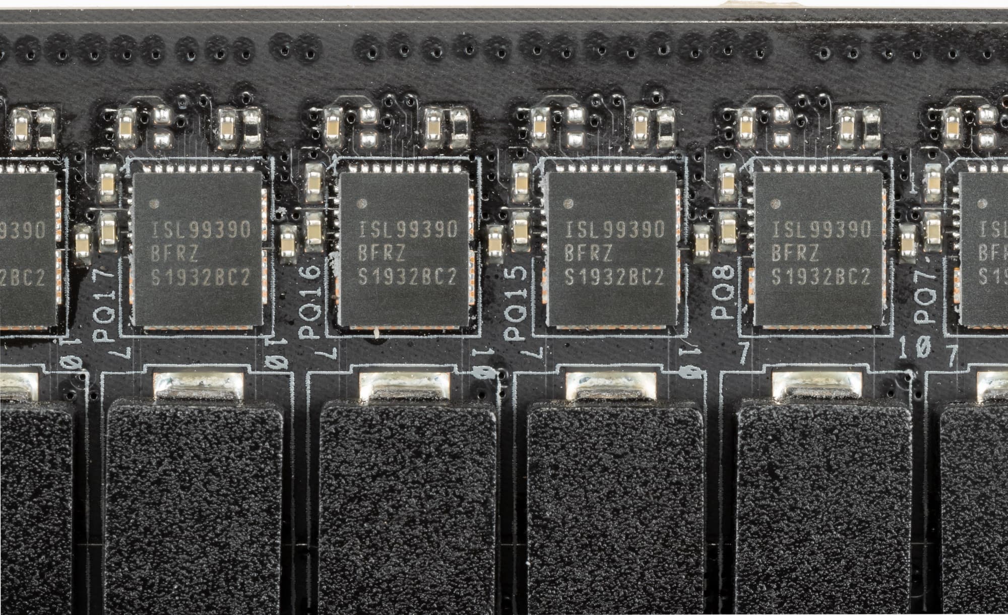 Таким образом схема питания на самом деле — 8×2. Каждый канал «псевдофазы» имеет суперферритовую катушку и мосфеты ISL99390 (до 90А) от того же Intersil/Renesas.