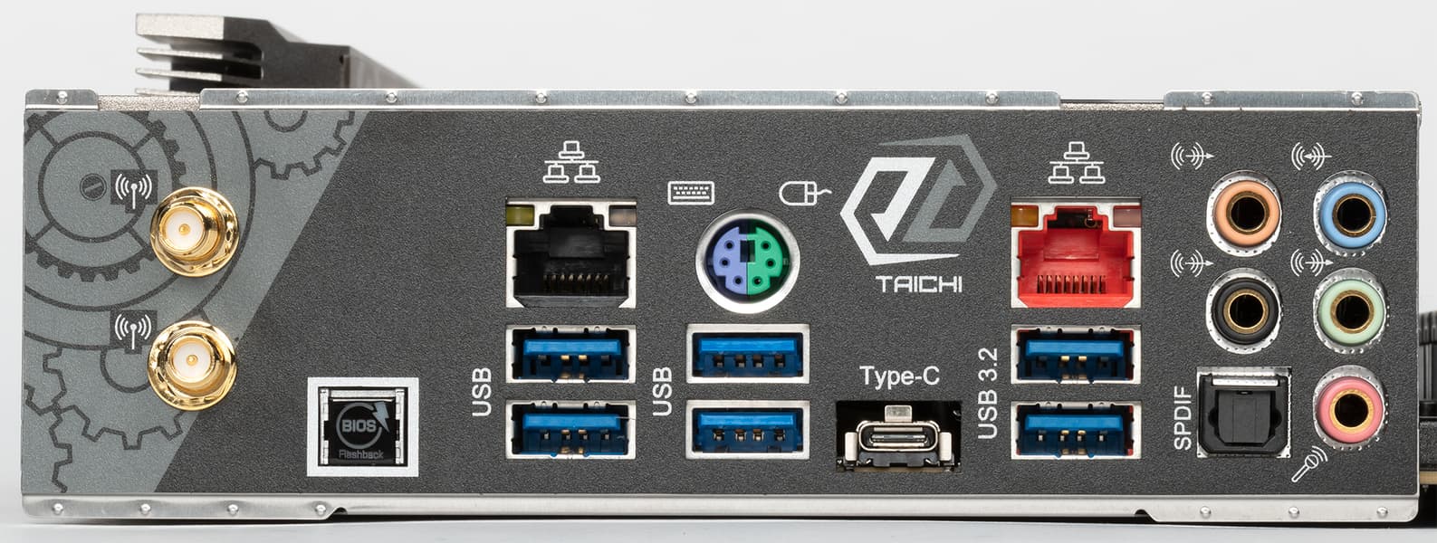 | Разъемы на задней панели | 1 × USB 3.2 Gen2x2 (Type-C) 2 × USB 3.2 Gen2 (Type-A) 4 × USB 3.2 Gen1 (Type-A) 2 × RJ-45 5 аудиоразъемов типа миниджек 2 антенных разъема 1 × S/PDIF (оптический, выход) 1 × PS/2 комбинированный разъем кнопка перепрошивки BIOS — Flashback |