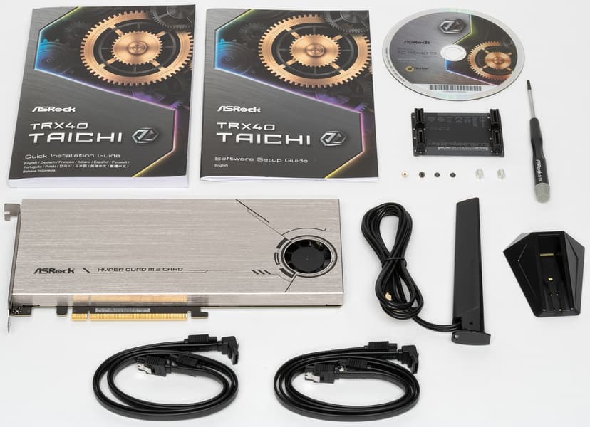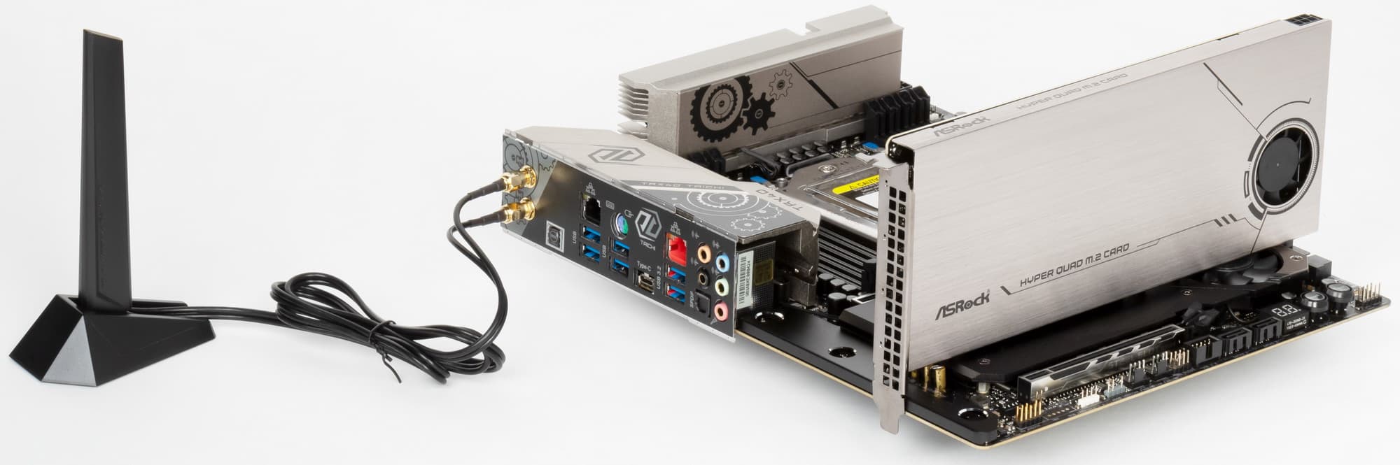 В комплекте поставки, кроме традиционных элементов типа руководства пользователя и кабелей SATA (что уже много лет является обязательным набором ко всем материнкам), есть плата для установки дополнительных M.2 портов (ASRock Hyper Quad M.2 card), антенна для беспроводной связи с подставкой, мост Nvidia SLI, винтики и фирменная отвертка для монтажа модулей M.2, накопитель типа CD.