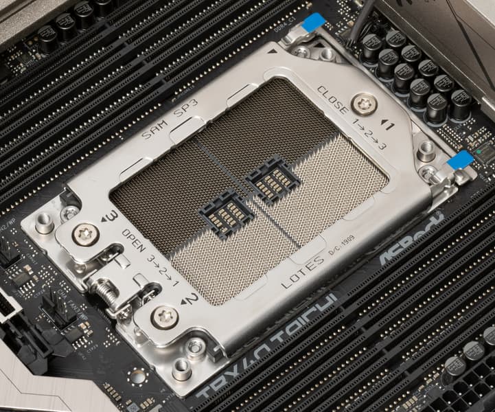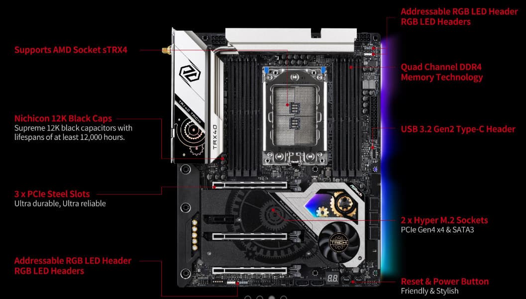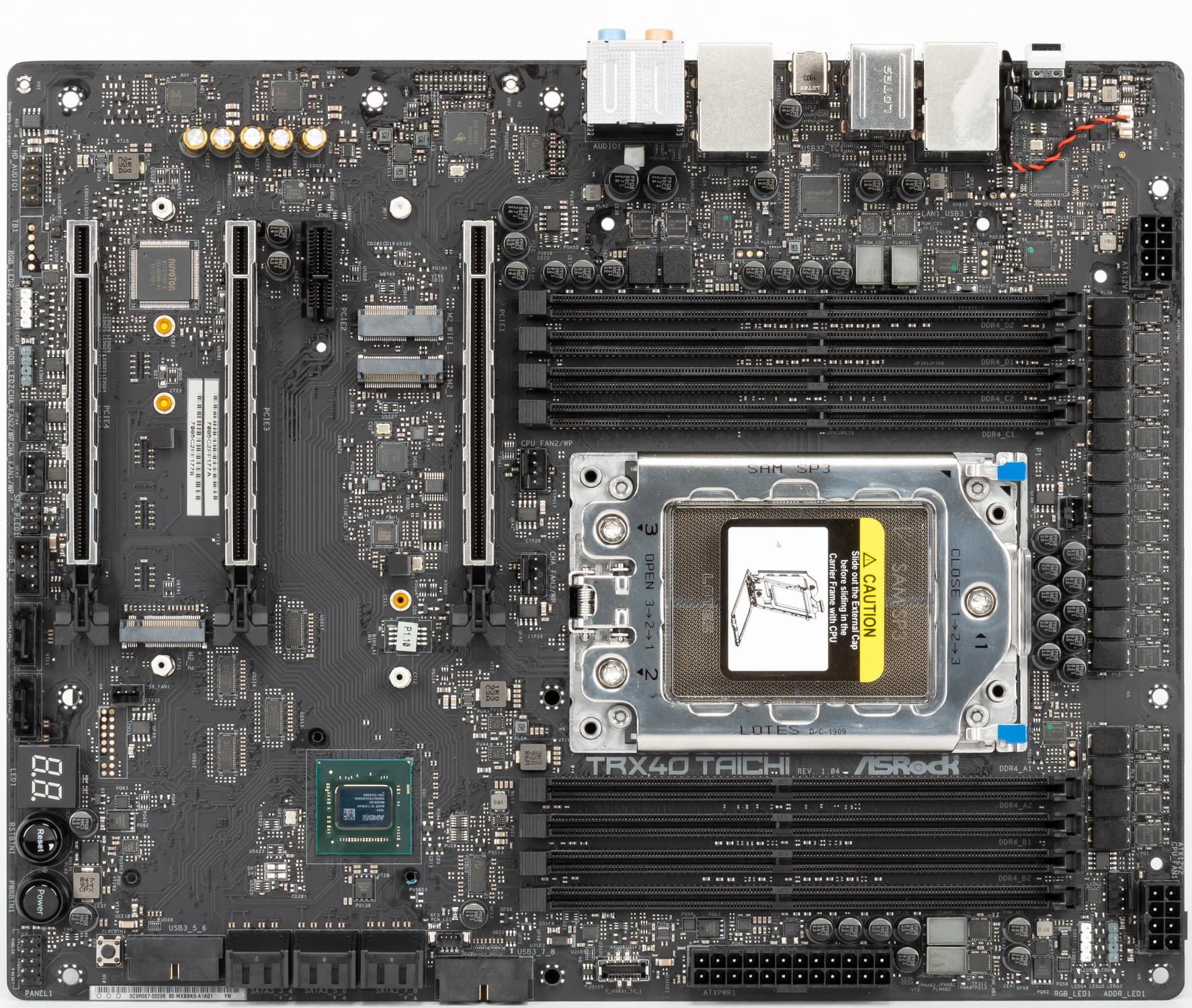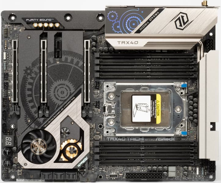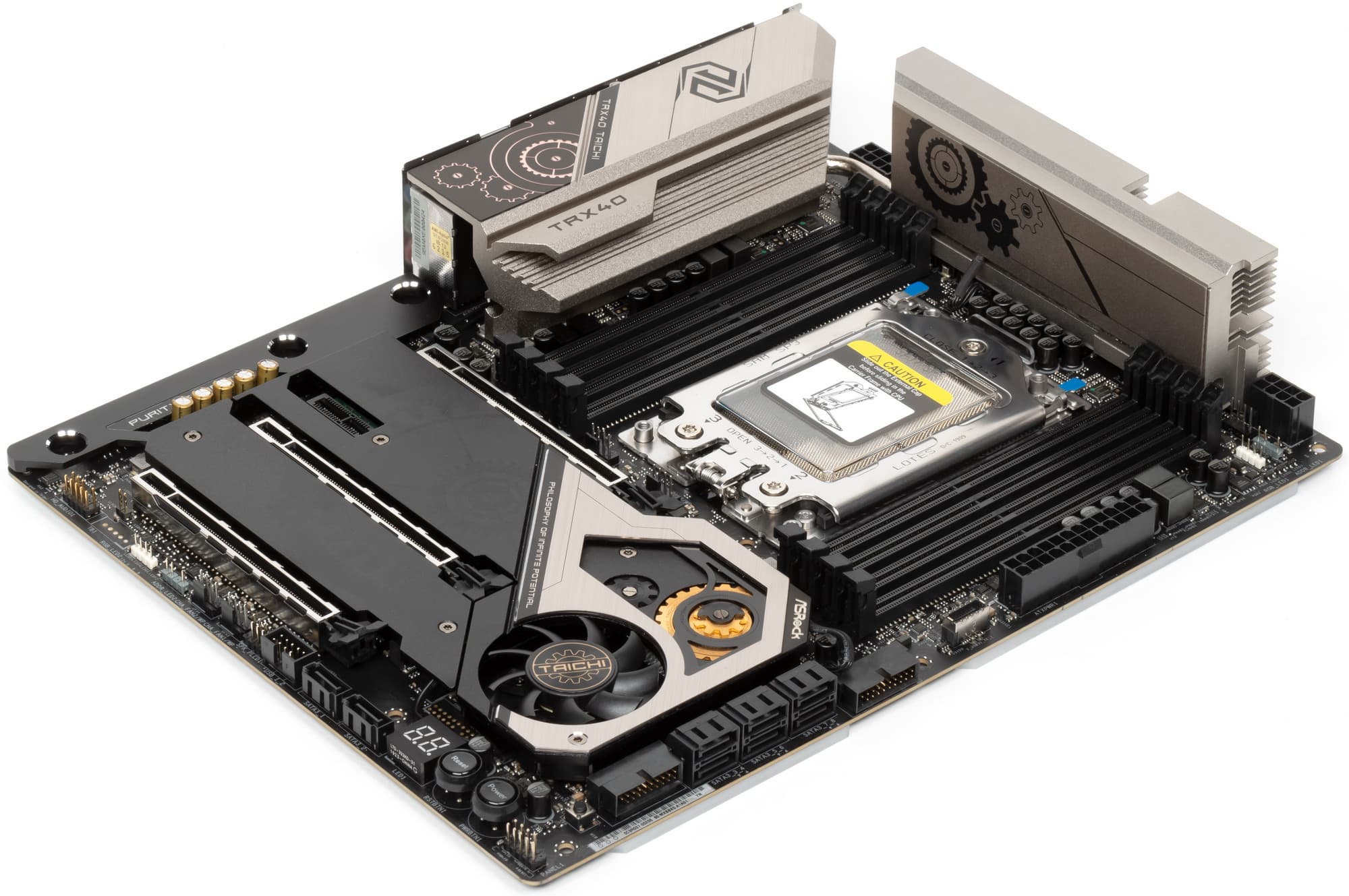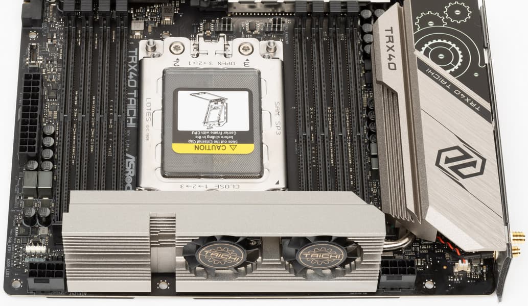 Еще раз надо напомнить, что ASRock TRX40 Taichi поддерживает процессоры AMD Ryzen Threadripper 3-го поколений, выполненные под разъем (сокет) sTR4X. Подчеркну, что Threadripper 1xxx/2xxx несовместимы с этим разъемом (сокет TR4 физически совместим с STR4X, но электрически сокеты не совместимы). Однако крепеж для систем охлаждения одинаковый, поэтому кулеры для TR4 подойдут и для sTR4X.