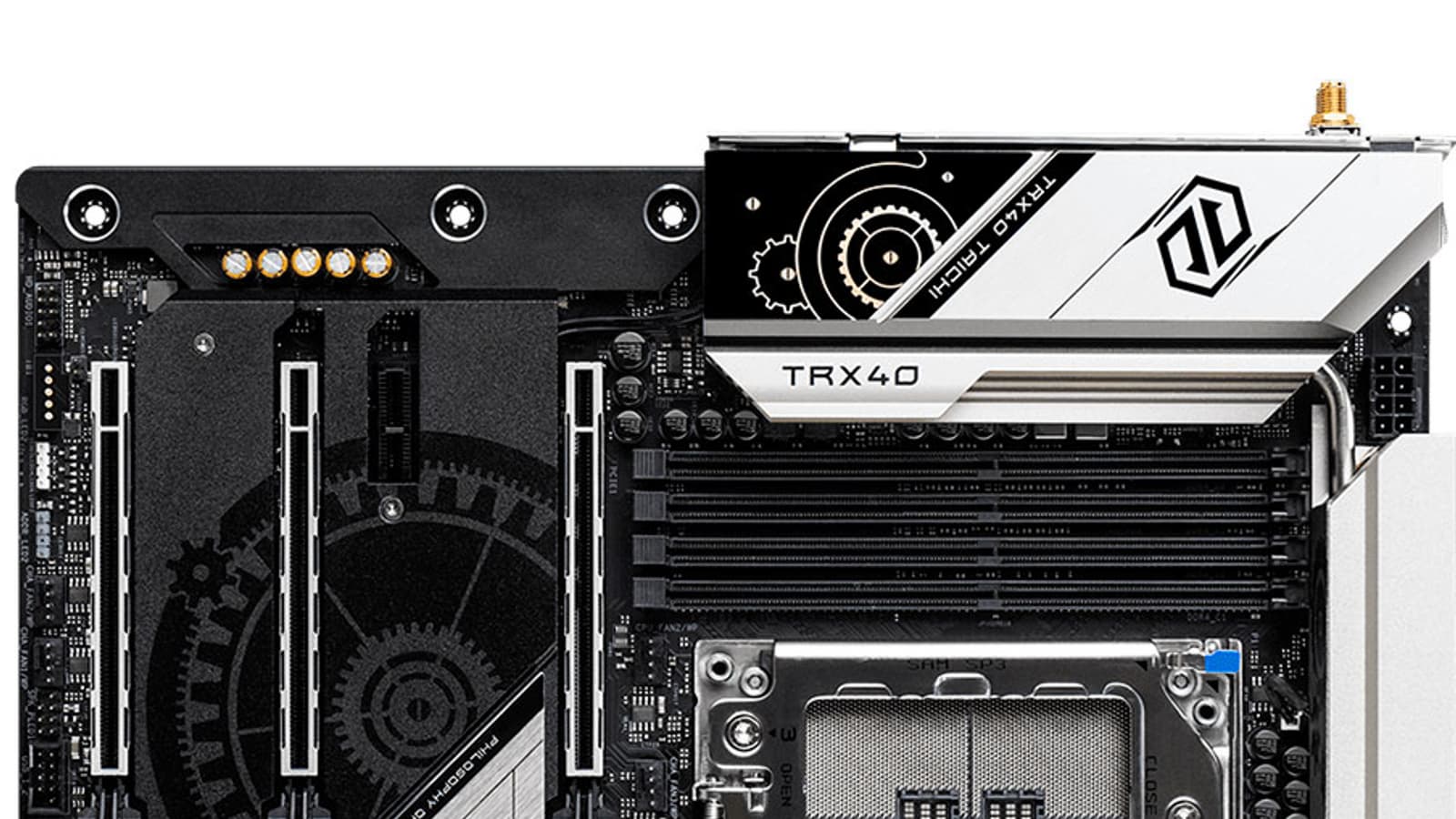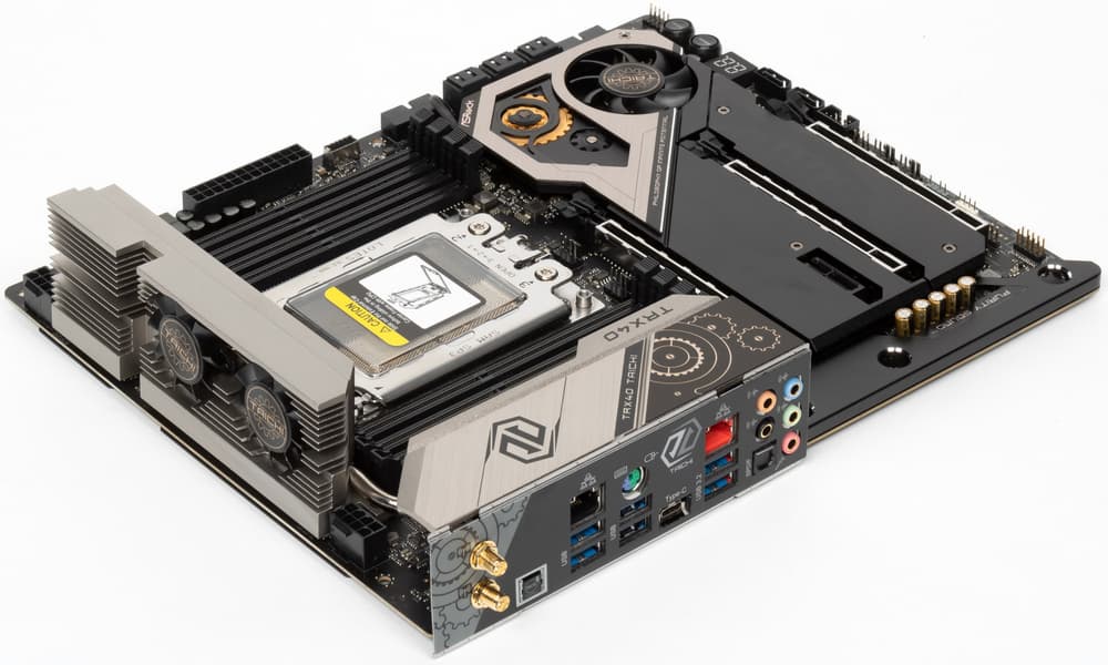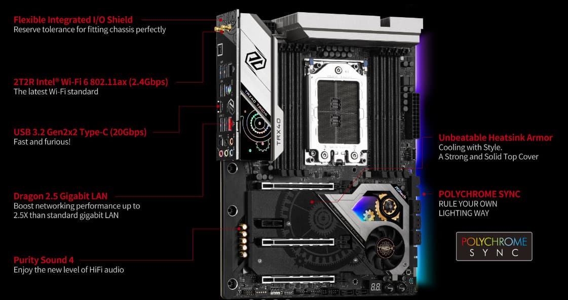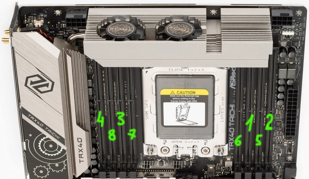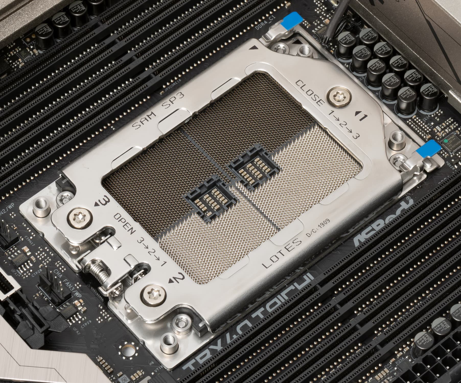 Еще раз надо напомнить, что ASRock TRX40 Taichi поддерживает процессоры AMD Ryzen Threadripper 3-го поколений, выполненные под разъем (сокет) sTR4X. Подчеркну, что Threadripper 1xxx/2xxx несовместимы с этим разъемом (сокет TR4 физически совместим с STR4X, но электрически сокеты не совместимы). Однако крепеж для систем охлаждения одинаковый, поэтому кулеры для TR4 подойдут и для sTR4X.