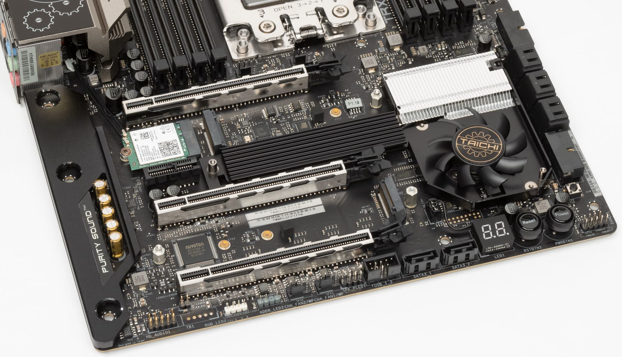 ASRock TRX40 Taichi — отлично сбалансированная материнская плата для HEDT со стоимостью около 40 тысяч рублей (ценники на «железо» для HEDT начинаются примерно с 25-27 тысяч). У нее средний набор периферийных возможностей: 14 портов USB всех видов (при этом самых быстрых маловато — всего 4, но имеется один сверхбыстрый USB 3.2 Gen2×2), 3 слота PCIe x16, которые всегда имеют 16 линий без разделения ресурсов с иной периферией, 2 проводных сетевых соединения (одно из которых — 2,5 Гбит/с), контроллер Wi-Fi 6, всего 5 разъемов для вентиляторов. Вроде бы не так шикарно, как у остальных флагманских плат, однако при этом ASRock TRX40 Taichi имеет не 2 или 3 слота M.2, как остальные, а 6! Да, 4 из них — на комплектной карте расширения ASRock Hyper Quad M.2, но мало кто найдет применение всем трем слотам PCIe x16, так что свободный слот можно занять этой картой. Из очевидных достоинств ASRock TRX40 Taichi — прекрасная система питания: 16 (8×2) фаз для ядра и 2 для SoC. Она способна обеспечить работу любых совместимых процессоров под полноценным авторазгоном — нужна лишь очень мощная ЖСО.