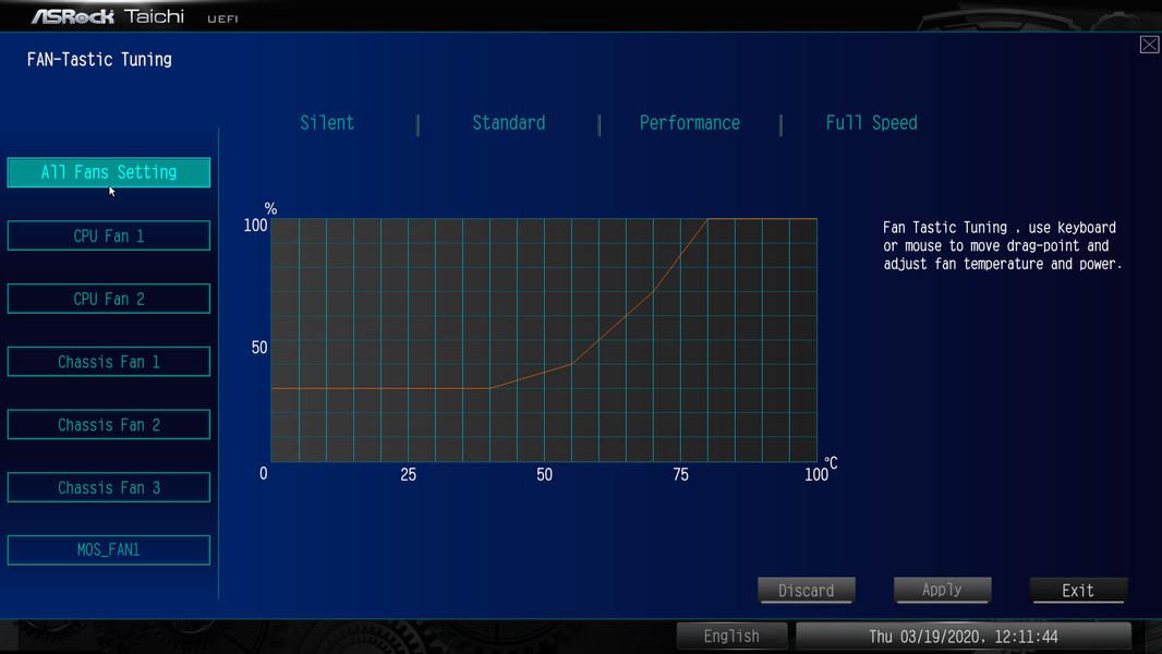 Наиболее интересной частью данной программы является возможность настраивания работы вентиляторов (мы не забываем, что у материнской платы есть 5 гнезд для подключения вентиляторов).