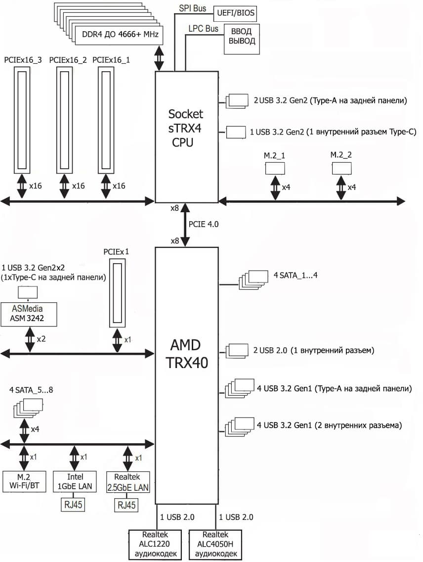 Помимо вышесказанного TRX40 поддерживает до 8 портов USB 3.2 Gen2, до 4 портов USB 2.0, и до 4 портов SATA.
