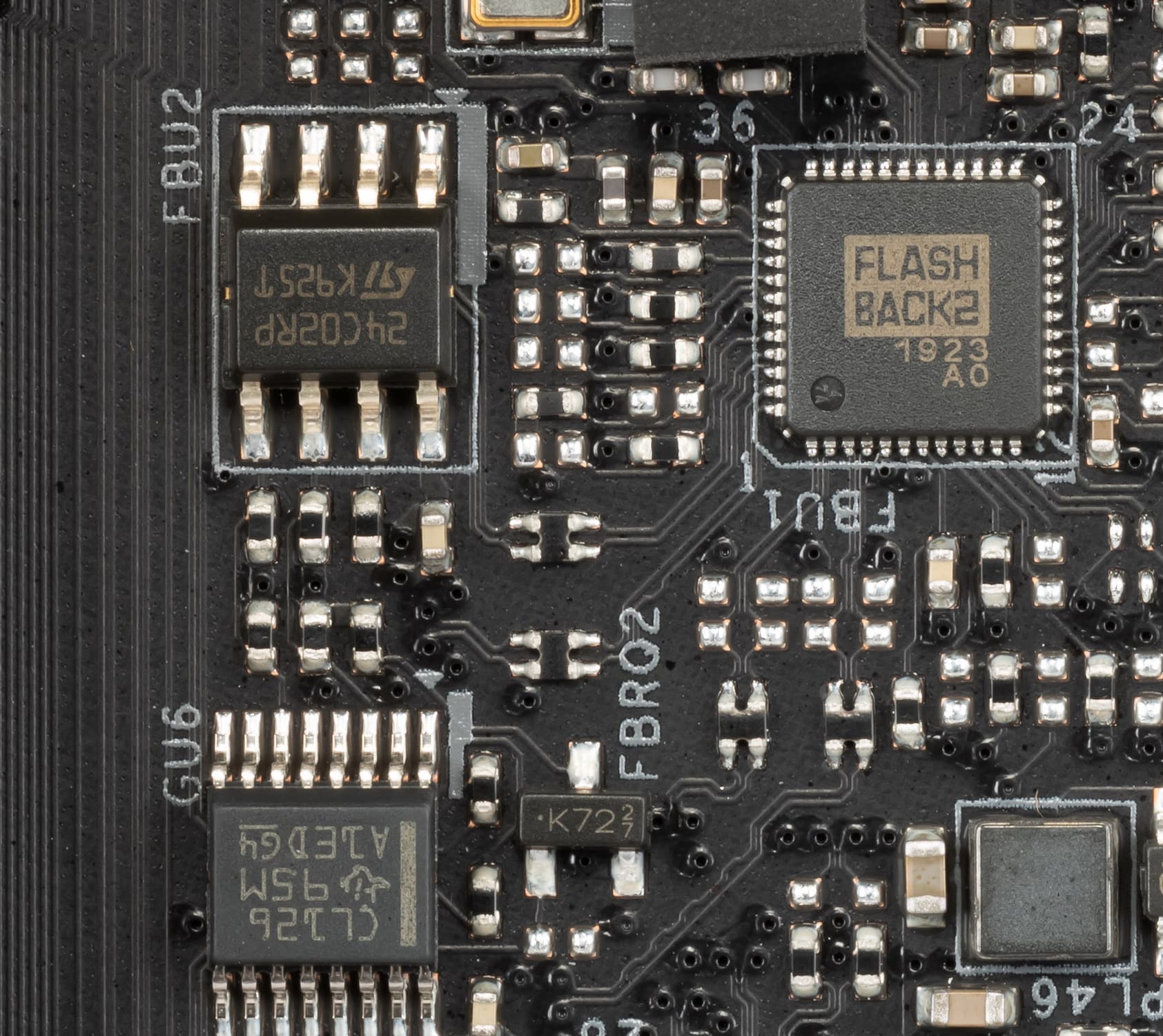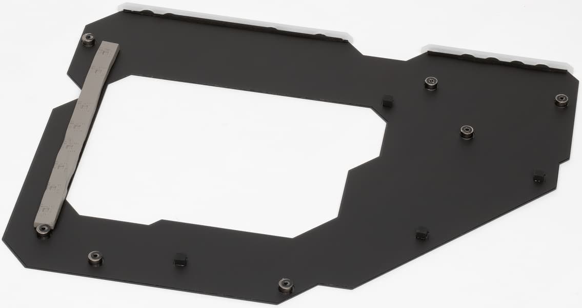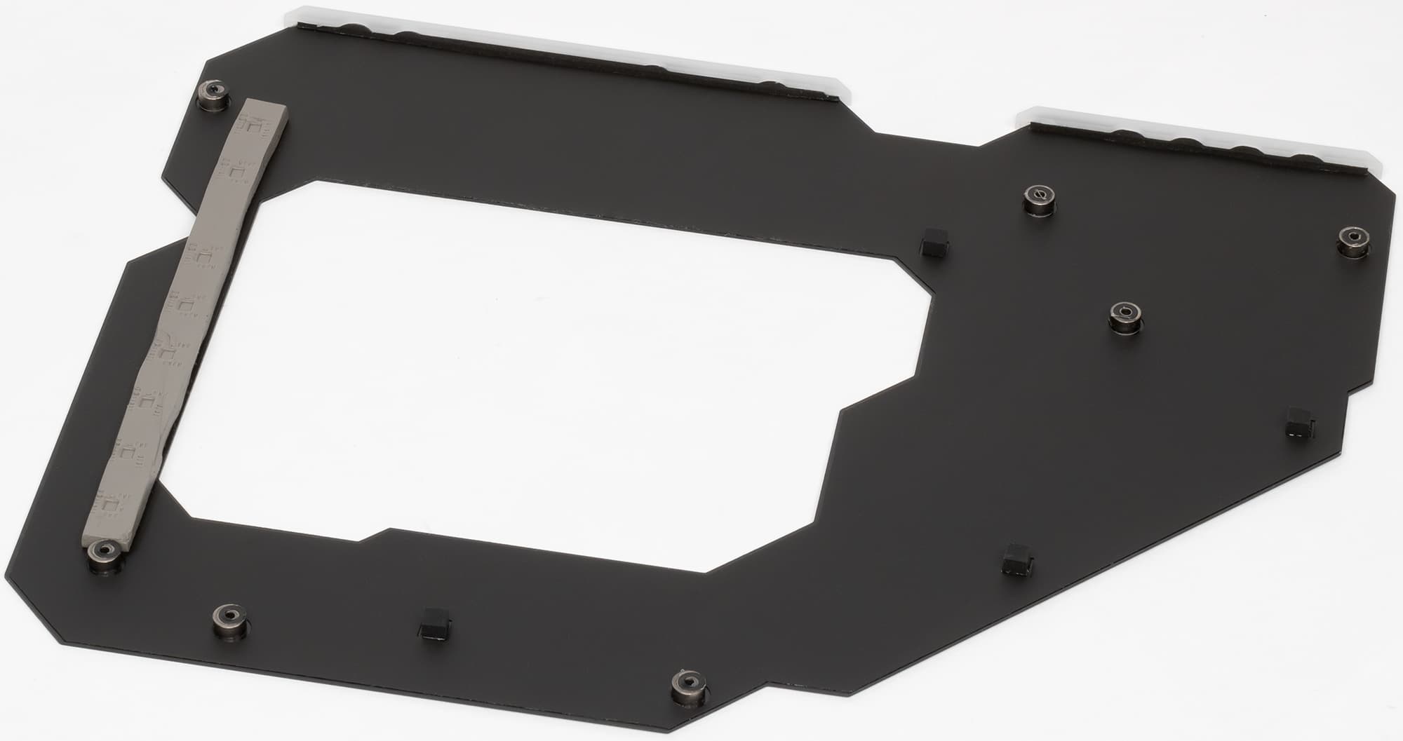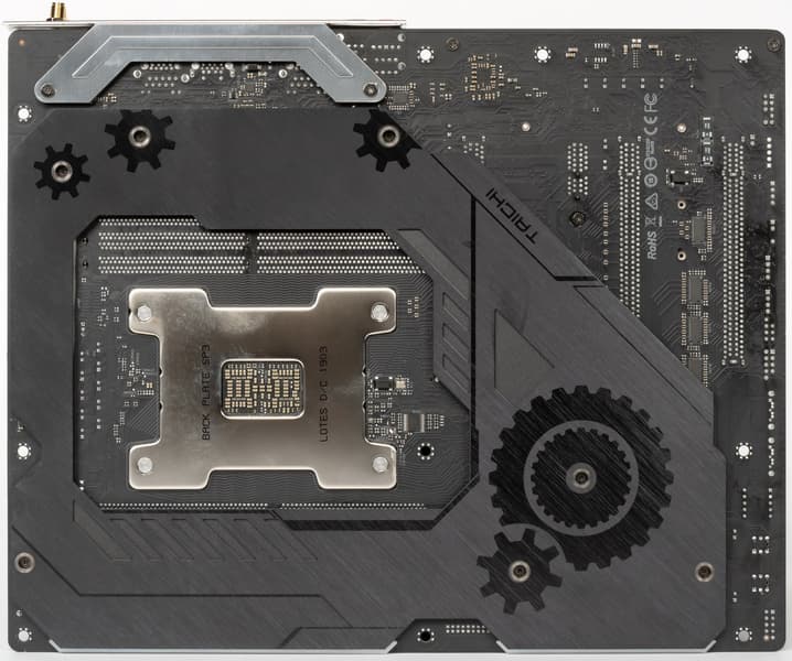 Стоит напомнить, что матплата имеет толстую металлическую пластину с оборотной стороны, которая через полоску термоинтерфейса также принимает участие в охлаждении PCB со стороны блока VRM. Пластина надежно электрически изолирована от печатной платы.