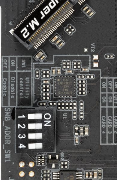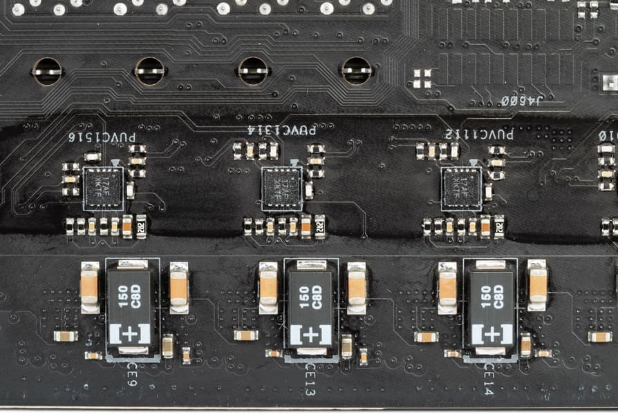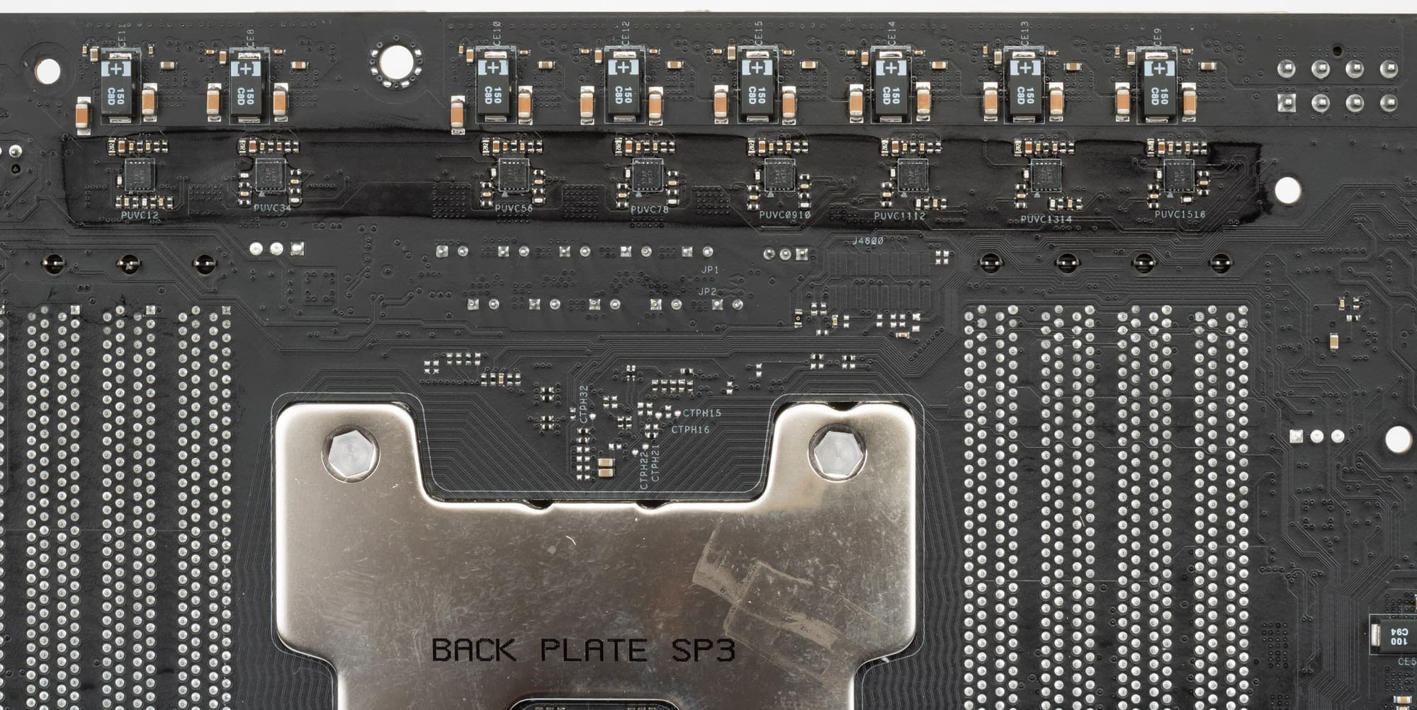 Система питания соответствует требованиям процессоров, которые очень много потребляют. Как мы знаем, у процессоров Ryzen Threadripper две схемы питания: для самого ядра и для SoC. Два 8-контактных гнезда EPS12V разнесены по разным концам PCB.