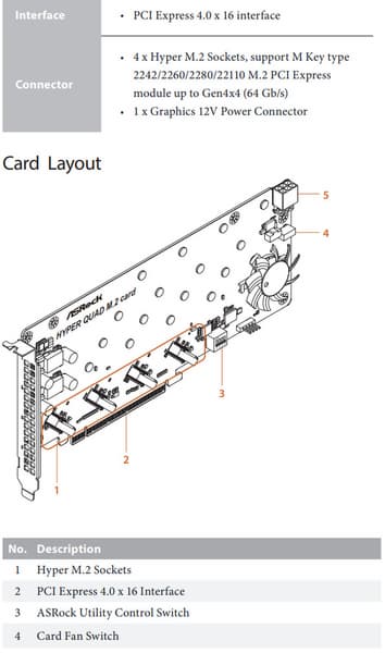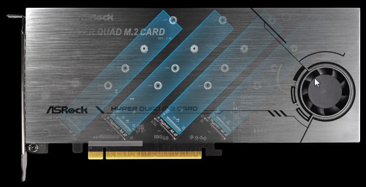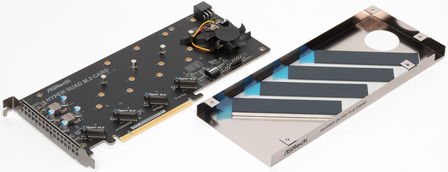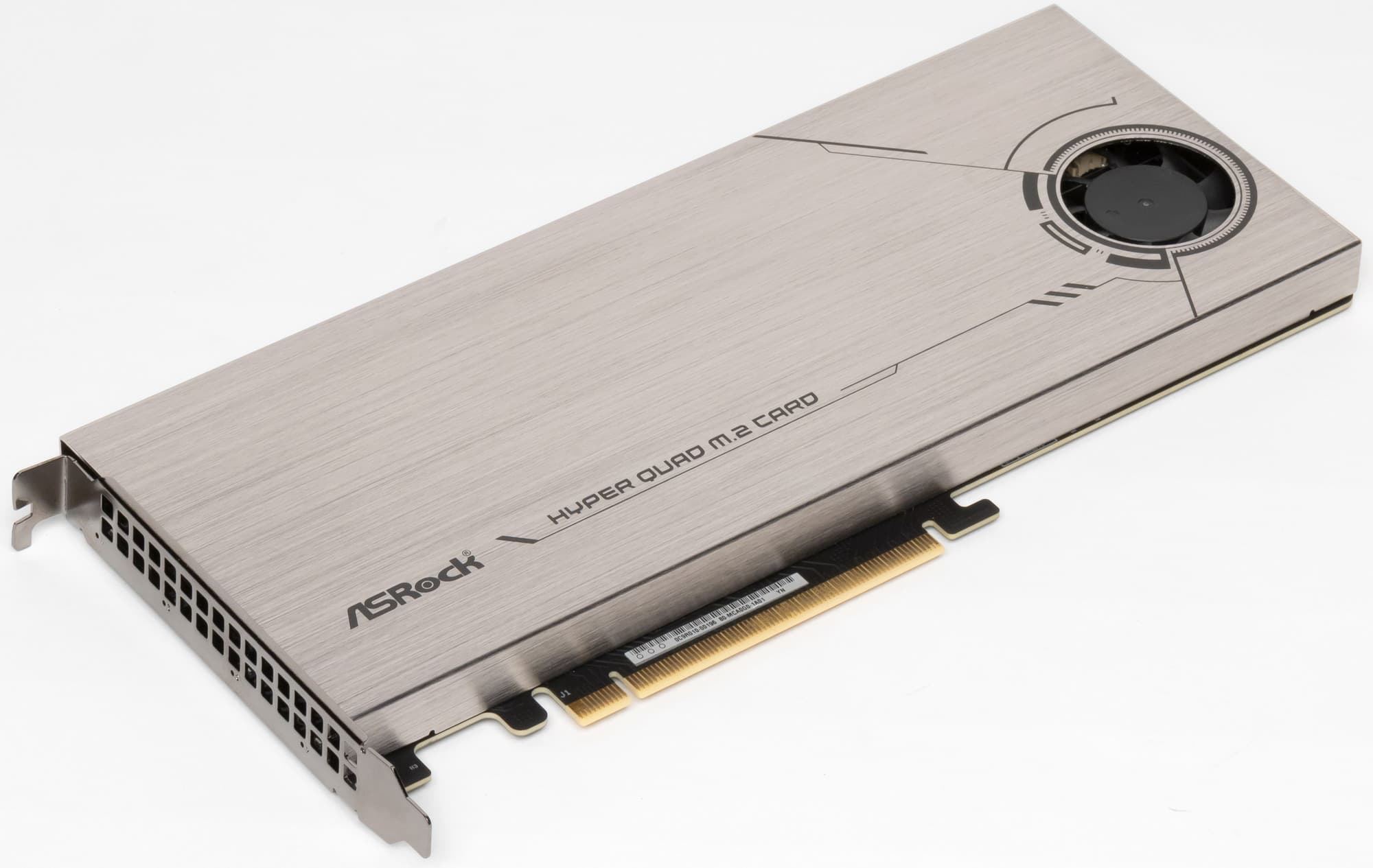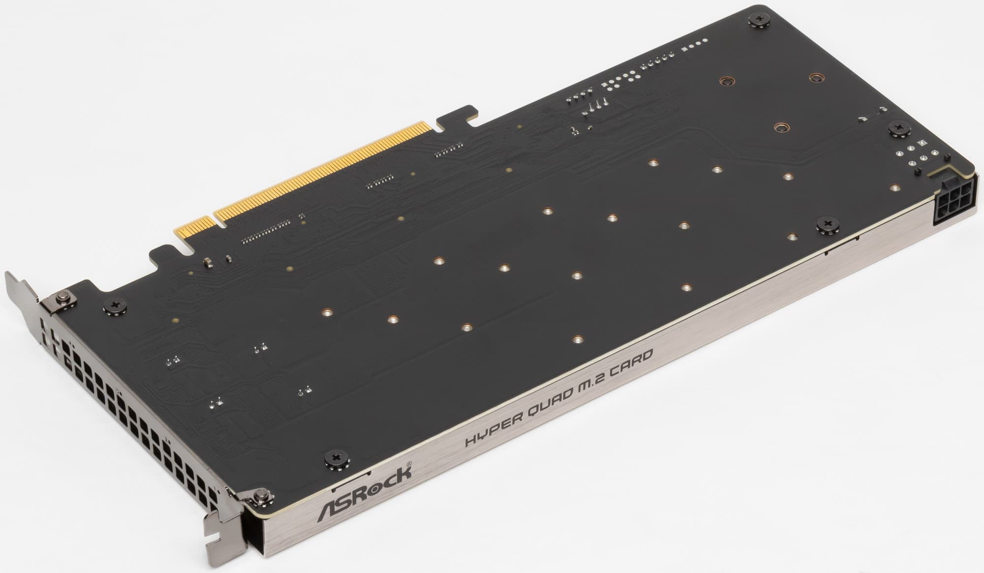 Да, выше я писал, что плата имеет всего два слота M.2. Но это именно физически расположенных на ней два слота. В составе комплекта материнки есть особая карта ASRock Hyper Quad M.2 card.