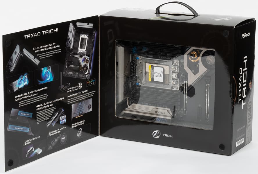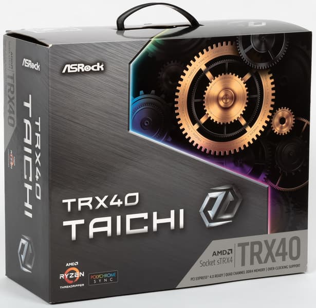 ASRock TRX40 Taichi поставляется в очень толстой коробке, имеющей откидывающуюся крышку за которой видна сама плата. Стальной холодный окрас, шестерни вечного механизма... Давайте посмотрим, что за механизм.