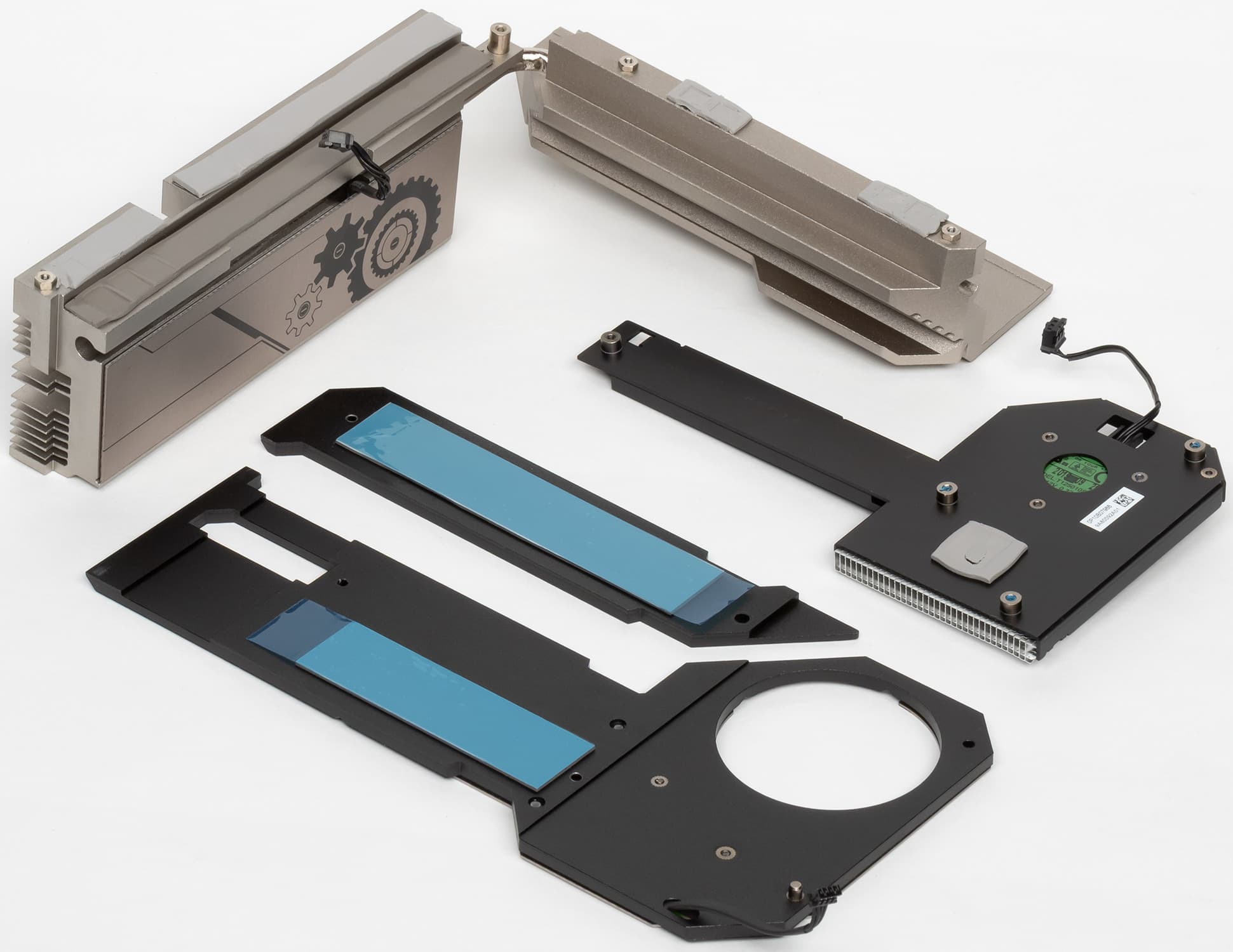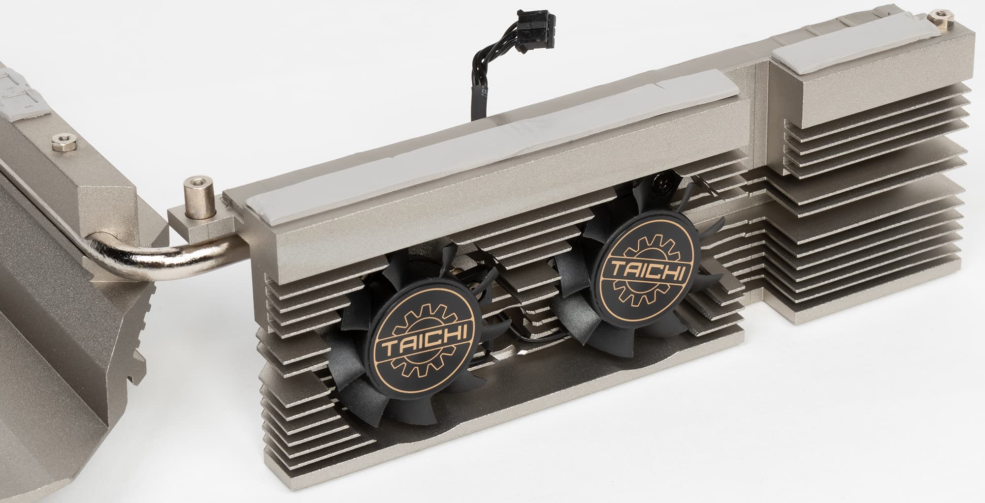 Для двух модулей M.2 (2_1 и 2_2), как я уже выше отмечал, есть свои радиаторы с термоинтерфейсами. Они крепятся самостоятельно и не принимают участия в общей схеме охлаждения (радиатор для M.2_1 также несет на себе декоративный кожух на чипсетный радиатор с подсветкой).